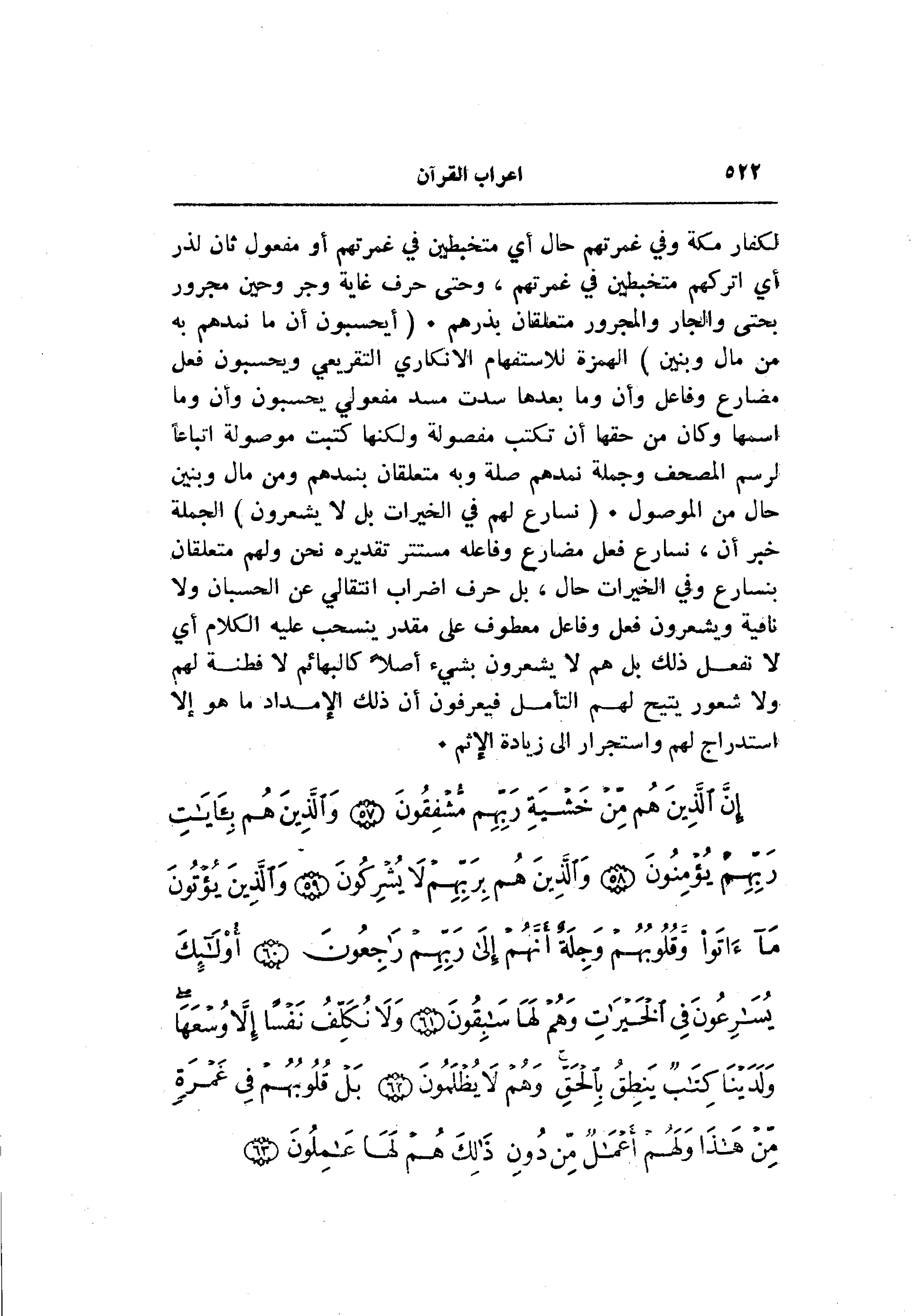 لكفار مكة وفي غمرتهم حال أي متخبطين في غمرتهم أو مفعول ثان لذر أي اتركهم متخبطين في غمرتهم، وحتى حرف غاية وجر وحين مجرور بحتى والجار والمجرور متعلقان بذرهم. (أَيَحْسَبُونَ أَنَّما نُمِدُّهُمْ بِهِ مِنْ مالٍ وَبَنِينَ) الهمزة للاستفهام الانكاري التقريعي ويحسبون فعل مضارع وفاعل وأن وما بعدها سدت مسد مفعولي يحسبون وأن وما اسمها وكان من حقها أن تكتب مفصولة ولكنها كتبت موصولة اتباعا لرسم المصحف وجملة نمدهم صلة وبه متعلقان بنمدهم ومن مال وبنين حال من الموصول. (نُسارِعُ لَهُمْ فِي الْخَيْراتِ بَلْ لا يَشْعُرُونَ) الجملة خبر أن، نسارع فعل مضارع وفاعله مستتر تقديره نحن ولهم متعلقان بنسارع وفي الخيرات حال، بل حرف إضراب انتقالي عن الحسبان ولا نافية ويشعرون فعل وفاعل معطوف على مقدر ينسحب عليه الكلام أي لا نفعل ذلك بل هم لا يشعرون بشيء أصلا كالبهائم لا فطنة لهم ولا شعور يتيح لهم التأمل فيعرفون أن ذلك الإمداد ما هو إلا استدراج لهم واستجرار الى زيادة الإثم.