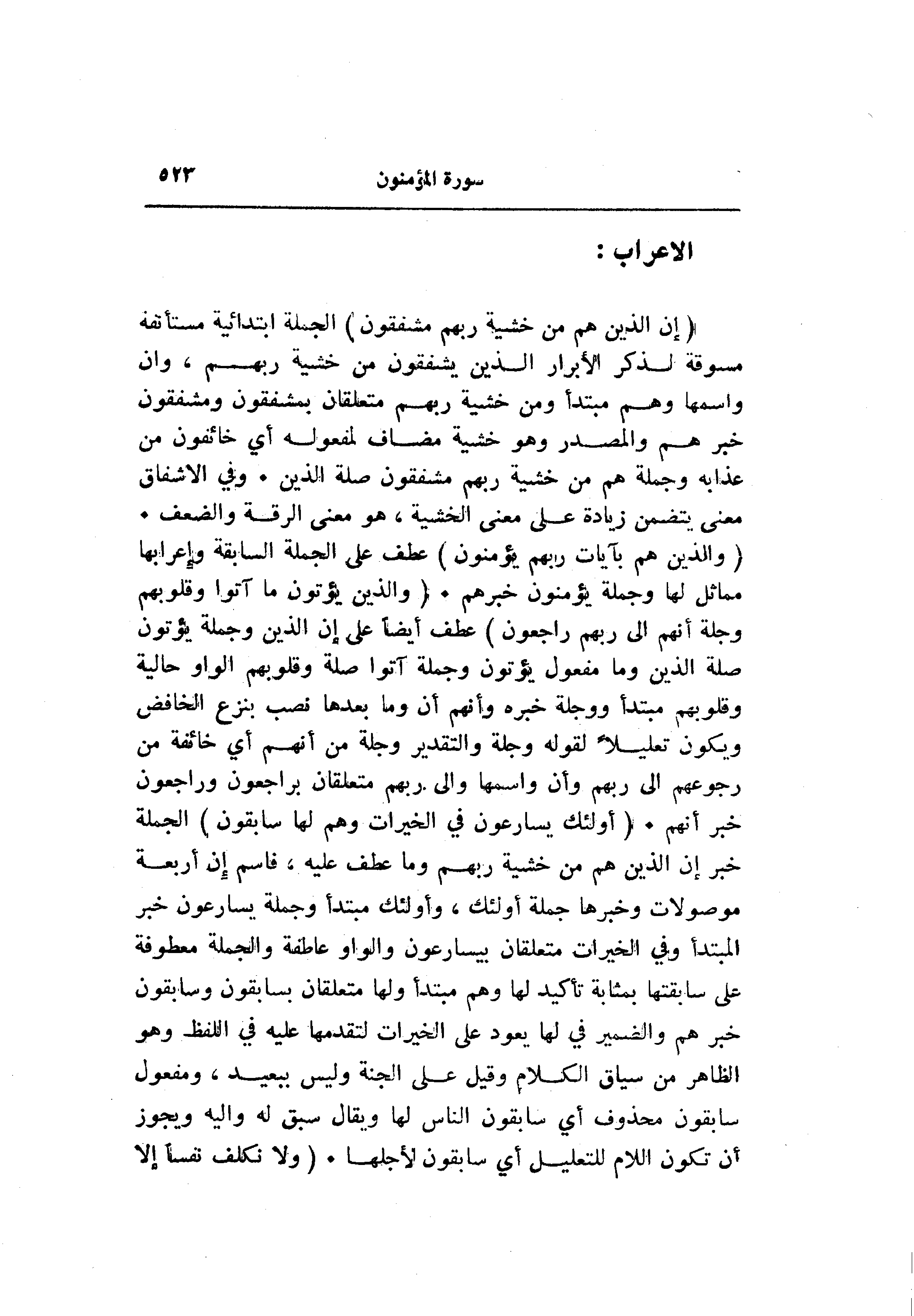 (وَالَّذِينَ هُمْ بِآياتِ رَبِّهِمْ يُؤْمِنُونَ) عطف على الجملة السابقة وإعرابها مماثل لها وجملة يؤمنون خبرهم. (وَالَّذِينَ يُؤْتُونَ ما آتَوْا وَقُلُوبُهُمْ وَجِلَةٌ أَنَّهُمْ إِلى رَبِّهِمْ راجِعُونَ) عطف أيضا على إن الذين وجملة يؤتون صلة الذين وما مفعول يؤتون وجملة آتوا صلة وقلوبهم الواو حالية وقلوبهم مبتدأ ووجلة خبره وأنهم أن وما بعدها نصب بنزع الخافض ويكون تعليلا لقوله وجلة والتقدير وجلة من أنهم أي خائفة من رجوعهم الى ربهم وأن واسمها والى ربهم متعلقان براجعون وراجعون خبر أنهم. (أُولئِكَ يُسارِعُونَ فِي الْخَيْراتِ وَهُمْ لَها سابِقُونَ) الجملة خبر إن الذين هم من خشية ربهم وما عطف عليه، فاسم إن أربعة موصولات وخبرها جملة أولئك، وأولئك مبتدأ وجملة يسارعون خبر المبتدأ وفي الخيرات متعلقان بيسارعون والواو عاطفة والجملة معطوفة على سابقتها بمثابة تأكيد لها وهم مبتدأ ولها متعلقان بسابقون وسابقون خبرهم والضمير في لها يعود على الخيرات لتقدمها عليه في اللفظ وهو الظاهر من سياق الكلام وقيل على الجنة وليس ببعيد، ومفعول سابقون محذوف أي سابقون الناس لها ويقال سبق له واليه ويجوز أن تكون اللام للتعليل أي سابقون لأجلها. (وَلا نُكَلِّفُ نَفْساً إِلَّا