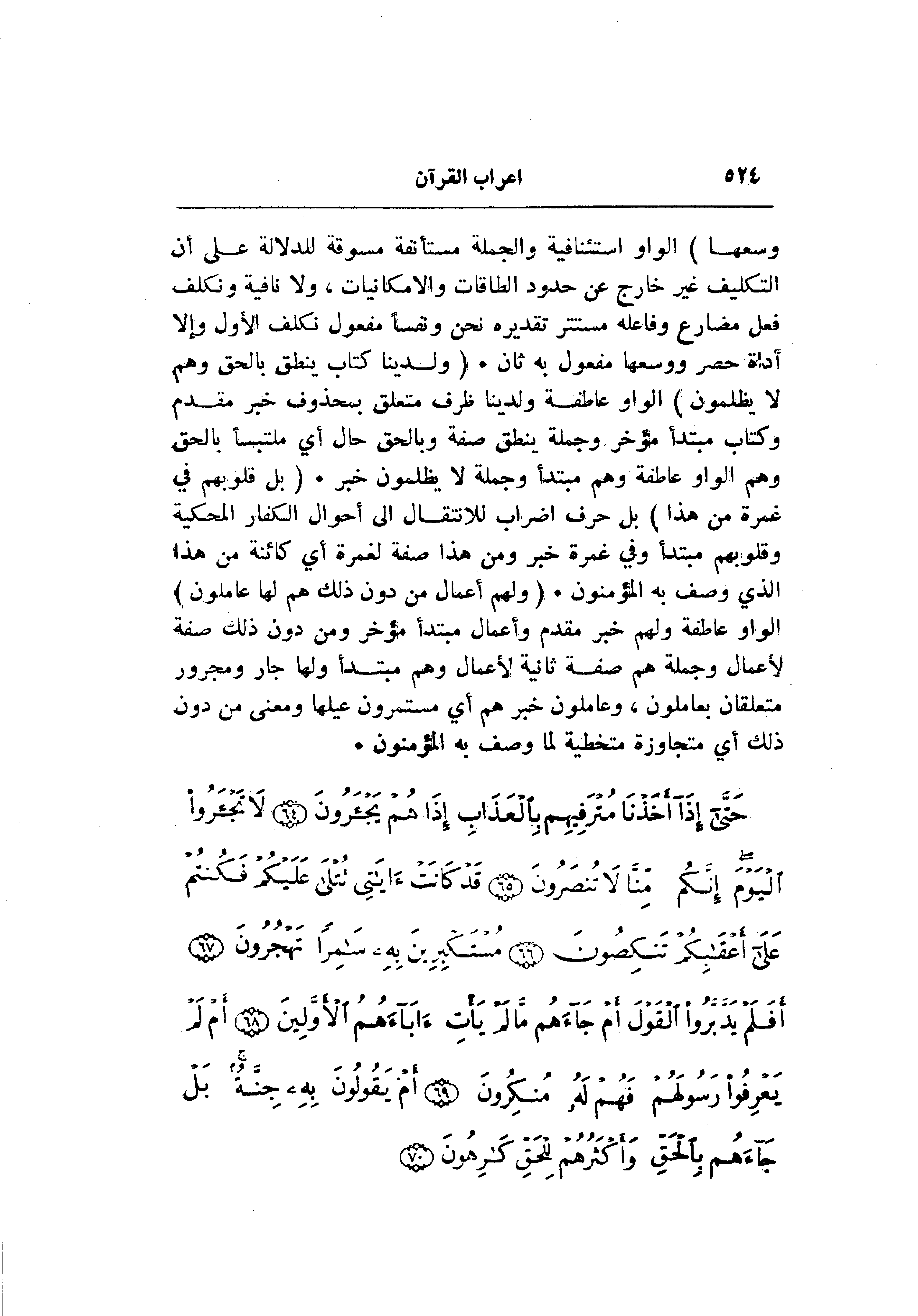 الواو استئنافية والجملة مستأنفة مسوقة للدلالة على أن التكليف غير خارج عن حدود الطاقات والامكانيات، ولا نافية ونكلف فعل مضارع وفاعله مستتر تقديره نحن ونفسا مفعول نكلف الأول وإلا أداة حصر ووسعها مفعول به ثان. (وَلَدَيْنا كِتابٌ يَنْطِقُ بِالْحَقِّ وَهُمْ لا يُظْلَمُونَ) الواو عاطفة ولدينا ظرف متعلق بمحذوف خبر مقدم وكتاب مبتدأ مؤخر وجملة ينطق صفة وبالحق حال أي ملتبسا بالحق وهم الواو عاطفة وهم مبتدأ وجملة لا يظلمون خبر. (بَلْ قُلُوبُهُمْ فِي غَمْرَةٍ مِنْ هذا) بل حرف إضراب للانتقال الى أحوال الكفار المحكية وقلوبهم مبتدأ وفي غمرة خبر ومن هذا صفة لغمرة أي كائنة من هذا الذي وصف به المؤمنون. (وَلَهُمْ أَعْمالٌ مِنْ دُونِ ذلِكَ هُمْ لَها عامِلُونَ) الواو عاطفة ولهم خبر مقدم وأعمال مبتدأ مؤخر ومن دون ذلك صفة لأعمال وجملة هم صفة ثانية لأعمال وهم مبتدأ ولها جار ومجرور متعلقان بعاملون، وعاملون خبر هم أي مستمرون عليها ومعنى من دون ذلك أي متجاوزة متخطية لما وصف به المؤمنون.