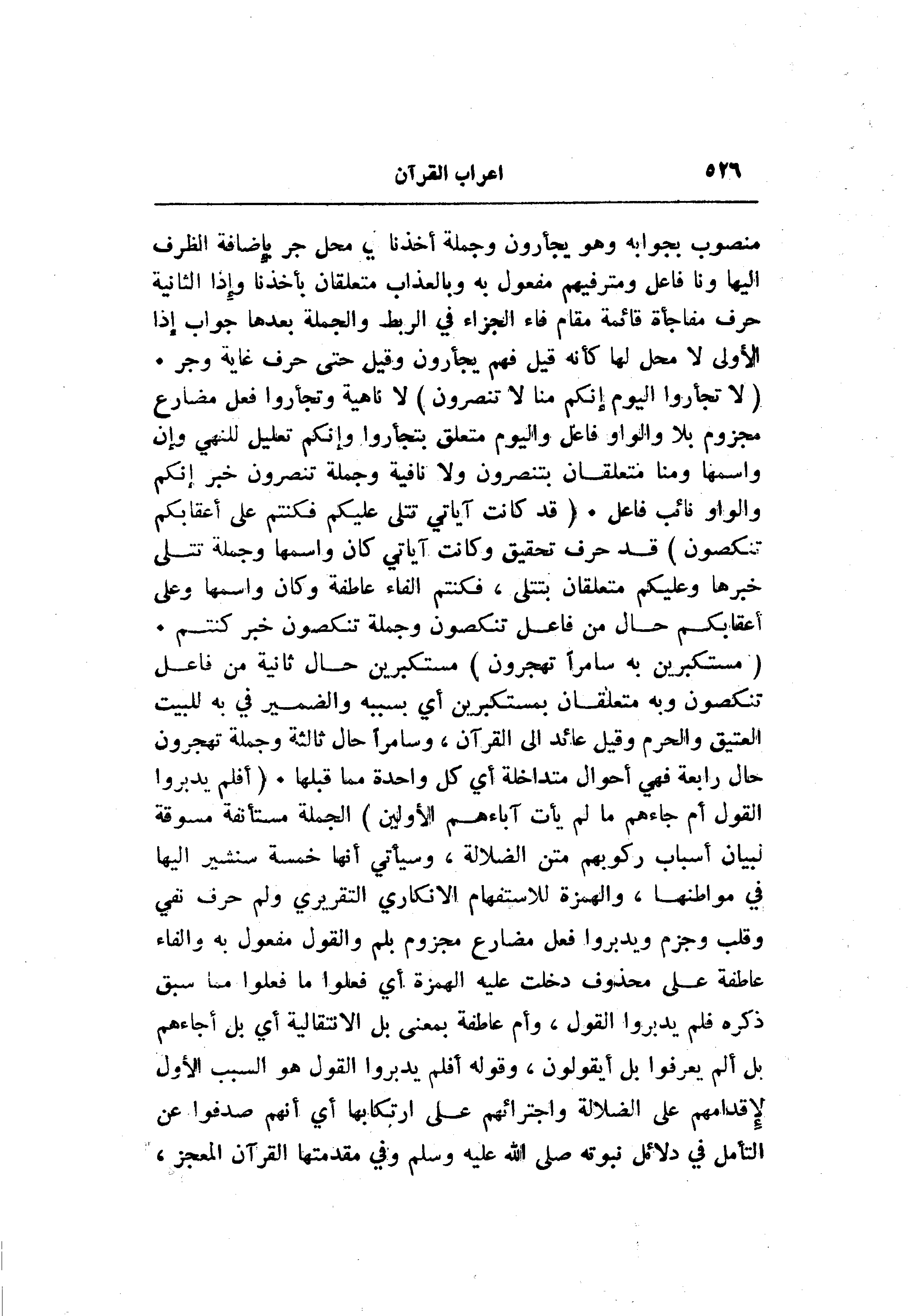 (لا تَجْأَرُوا الْيَوْمَ إِنَّكُمْ مِنَّا لا تُنْصَرُونَ) لا ناهية وتجأروا فعل مضارع مجزوم بلا والواو فاعل واليوم متعلق بتجأروا وإنكم تعليل للنهي وإن واسمها ومنا متعلقان بتنصرون ولا نافية وجملة تنصرون خبر إنكم والواو نائب فاعل. (قَدْ كانَتْ آياتِي تُتْلى عَلَيْكُمْ فَكُنْتُمْ عَلى أَعْقابِكُمْ تَنْكِصُونَ) قد حرف تحقيق وكانت آياتي كان واسمها وجملة تتلى خبرها وعليكم متعلقان بتتلى، فكنتم الفاء عاطفة وكان واسمها وعلى أعقابكم حال من فاعل تنكصون وجملة تنكصون خبر كنتم.