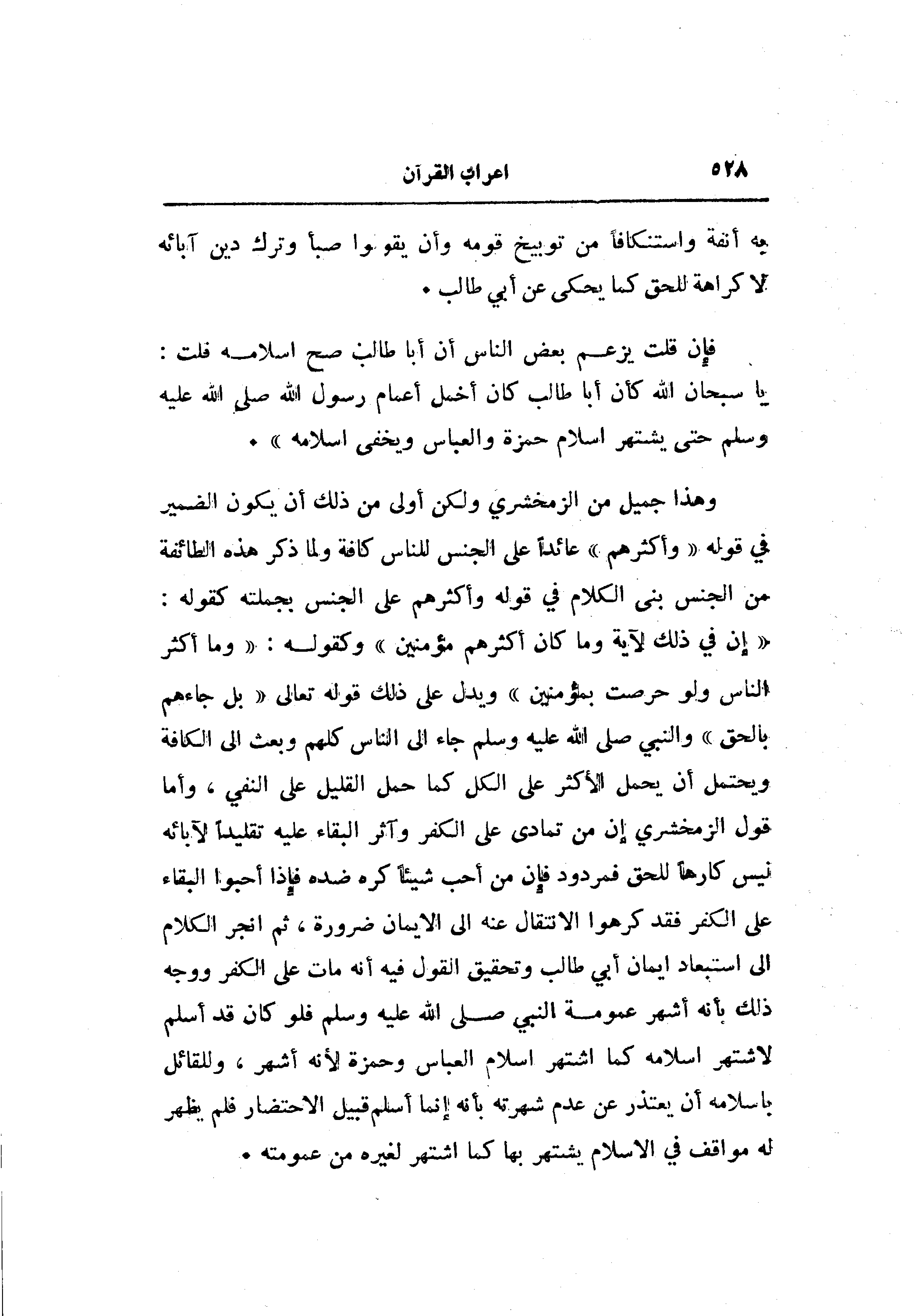«إن في ذلك لآية وما كان أكثرهم مؤمنين» وكقوله: «وما أكثر الناس ولو حرصت بمؤمنين» ويدل على ذلك قوله تعالى «بَلْ جاءَهُمْ بِالْحَقِّ» والنبي صلى الله عليه وسلم جاء الى الناس كلهم وبعث الى الكافة ويحتمل أن يحمل الأكثر على الكل كما حمل القليل على النفي، وأما قول الزمخشري إن من تمادى على الكفر وآثر البقاء عليه تقليدا لآبائه ليس كارها للحق فمردود فإن من أحب شيئا كره ضده فإذا أحبوا البقاء على الكفر فقد كرهوا الانتقال عنه الى الايمان ضرورة، ثم انجر الكلام الى استبعاد ايمان أبي طالب وتحقيق القول فيه أنه مات على الكفر ووجه ذلك بأنه أشهر عمومة النبي صلى الله عليه وسلم فلو كان قد أسلم لاشتهر إسلامه كما اشتهر اسلام العباس وحمزة لأنه أشهر، وللقائل بإسلامه أن يعتذر عن عدم شهرته بأنه إنما أسلم قبيل الاحتضار فلم يظهر له مواقف في الإسلام يشتهر بها كما اشتهر لغيره من عمومته.