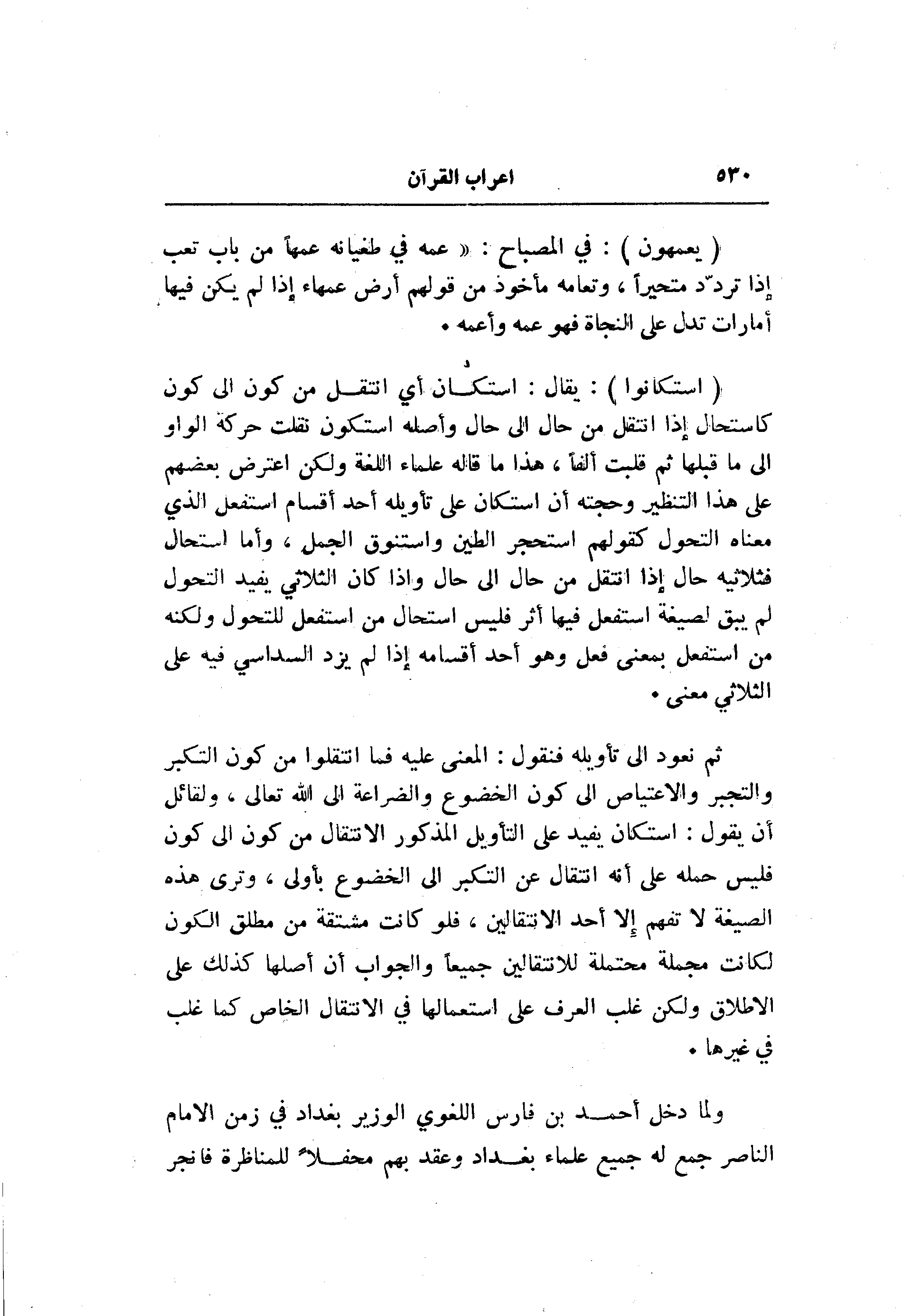 ثم نعود الى تأويله فنقول: المعنى عليه فما انتقلوا من كون التكبر والتجبر والاعتياض الى كون الخضوع والضراعة الى الله تعالى، ولقائل أن يقول: استكان يفيد على التأويل المذكور الانتقال من كون الى كون فليس حمله على أنه انتقال عن التكبر الى الخضوع بأولى، وترى هذه الصيغة لا تفهم إلا أحد الانتقالين، فلو كانت مشتقة من مطلق الكون لكانت مجملة محتملة للانتقالين جميعا والجواب أن أصلها كذلك على الإطلاق ولكن غلب العرف على استعمالها في الانتقال الخاص كما غلب في غيرها.