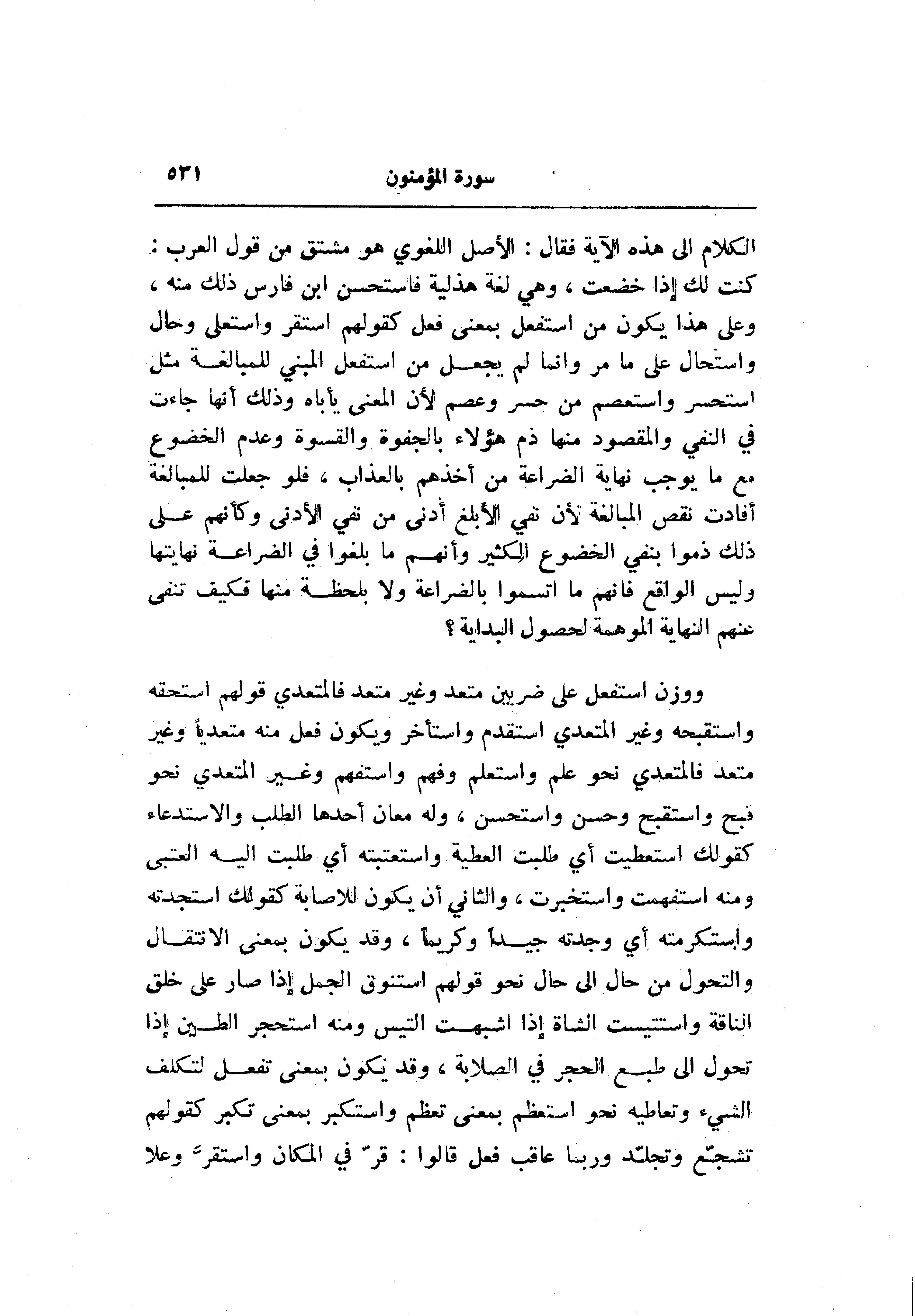 كنت لك إذا خضعت، وهي لغة هذلية فاستحسن ابن فارس ذلك منه، وعلى هذا يكون من استفعل بمعنى فعل كقولهم استقر واستعلى وحال واستحال على ما مر وانما لم يجعل من استفعل المبني للمبالغة مثل استحسر واستعصم من حسر وعصم لأن المعنى يأباه وذلك أنها جاءت في النفي والمقصود منها ذم هؤلاء بالجفوة والقسوة وعدم الخضوع مع ما يوجب نهاية الضراعة من أخذهم بالعذاب، فلو جعلت للمبالغة أفادت نقص المبالغة لأن نفي الأبلغ أدنى من نفي الأدنى وكأنهم على ذلك ذموا بنفي الخضوع الكثير وأنهم ما بلغوا في الضراعة نهايتها وليس الواقع فانهم ما اتسموا بالضراعة ولا بلحظة منها فكيف تنفى عنهم النهاية الموهمة لحصول البداية؟