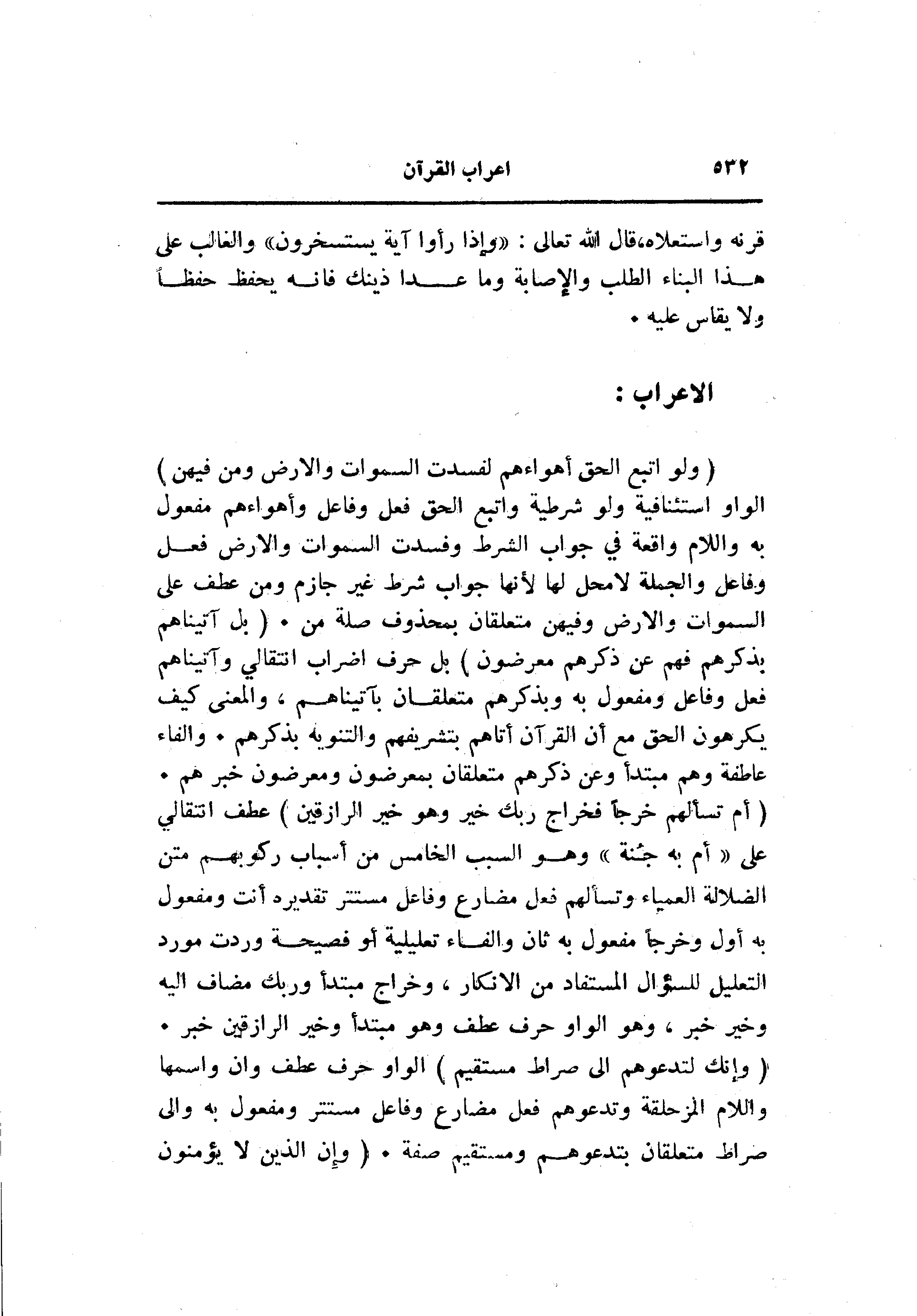(وَلَوِ اتَّبَعَ الْحَقُّ أَهْواءَهُمْ لَفَسَدَتِ السَّماواتُ وَالْأَرْضُ وَمَنْ فِيهِنَّ) الواو استئنافية ولو شرطية واتبع الحق فعل وفاعل وأهواءهم مفعول به واللام واقعة في جواب الشرط وفسدت السموات والأرض فعل وفاعل والجملة لا محل لها لأنها جواب شرط غير جازم ومن عطف على السموات والأرض وفيهن متعلقان بمحذوف صلة من. (بَلْ أَتَيْناهُمْ بِذِكْرِهِمْ فَهُمْ عَنْ ذِكْرِهِمْ مُعْرِضُونَ)