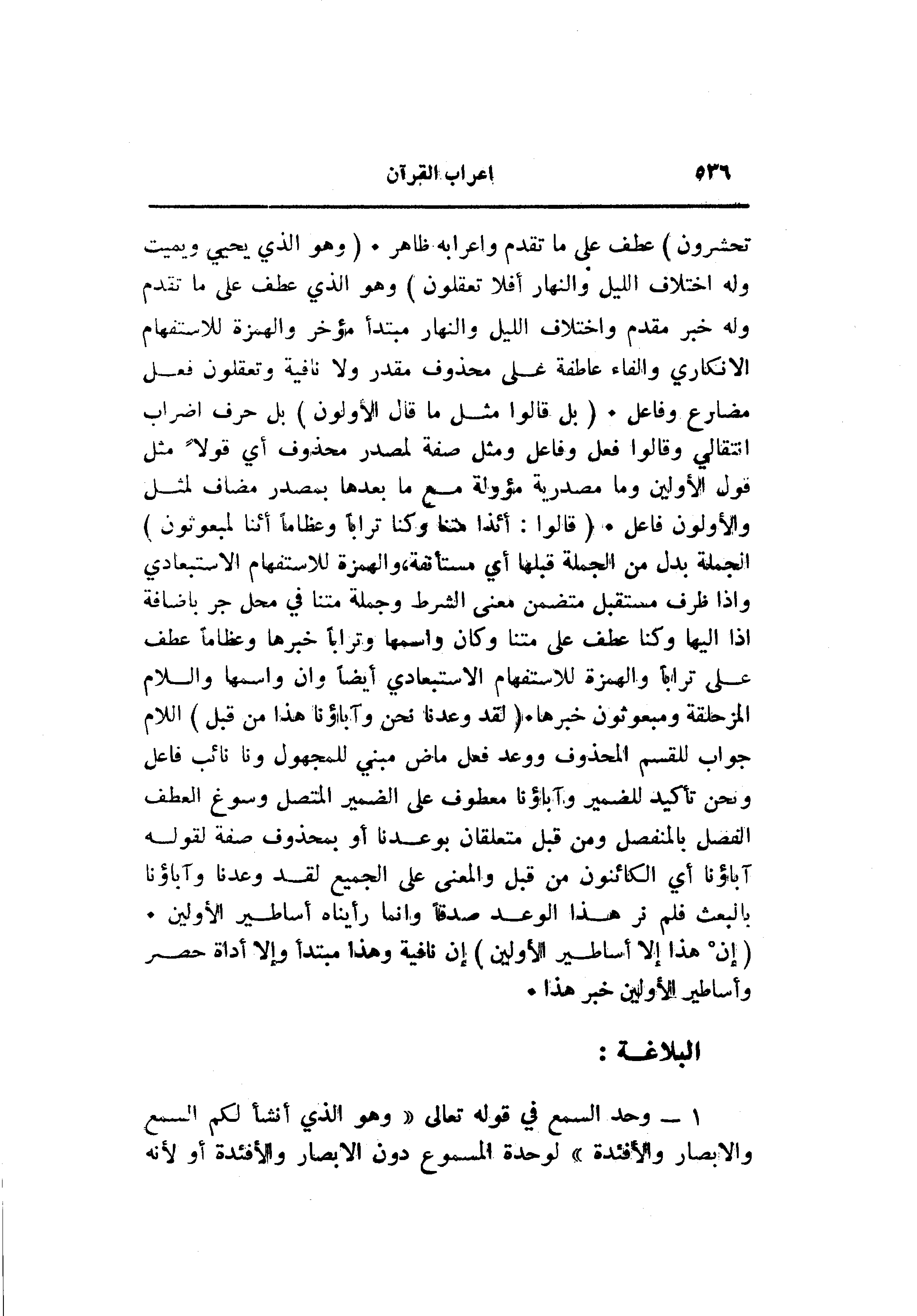 عطف على ما تقدم وإعرابه ظاهر. (وَهُوَ الَّذِي يُحْيِي وَيُمِيتُ وَلَهُ اخْتِلافُ اللَّيْلِ وَالنَّهارِ أَفَلا تَعْقِلُونَ) وهو الذي عطف على ما تقدم وله خبر مقدم واختلاف الليل والنهار مبتدأ مؤخر والهمزة للاستفهام الانكاري والفاء عاطفة على محذوف مقدر ولا نافية وتعقلون فعل مضارع وفاعل. (بَلْ قالُوا مِثْلَ ما قالَ الْأَوَّلُونَ) بل حرف إضراب انتقالي وقالوا فعل وفاعل ومثل صفة لمصدر محذوف أي قولا مثل قول الأولين وما مصدرية مؤولة مع ما بعدها بمصدر مضاف لمثل والأولون فاعل. (قالُوا: أَإِذا مِتْنا وَكُنَّا تُراباً وَعِظاماً أَإِنَّا لَمَبْعُوثُونَ) الجملة بدل من الجملة قبلها أي مستأنفة، والهمزة للاستفهام الاستبعادي وإذا ظرف مستقبل متضمن معنى الشرط وجملة متنا في محل جر باضافة إذا إليها وكنا عطف على متنا وكان واسمها وترابا خبرها وعظاما عطف على ترابا والهمزة للاستفهام الاستبعادي أيضا وان واسمها واللام المزحلقة ومبعوثون خبرها. (لَقَدْ وُعِدْنا نَحْنُ وَآباؤُنا هذا مِنْ قَبْلُ) اللام جواب للقسم المحذوف ووعد فعل ماض مبني للمجهول ونا نائب فاعل ونحن تأكيد للضمير وآباؤنا معطوف على الضمير المتصل وسوغ العطف الفصل بالمنفصل ومن قبل متعلقان بوعدنا أو بمحذوف صفة لقوله آباؤنا أي الكائنون من قبل والمعنى على الجميع لقد وعدنا وآباؤنا بالبعث فلم نر هذا الوعد صدقا وانما رأيناه أساطير الأولين.