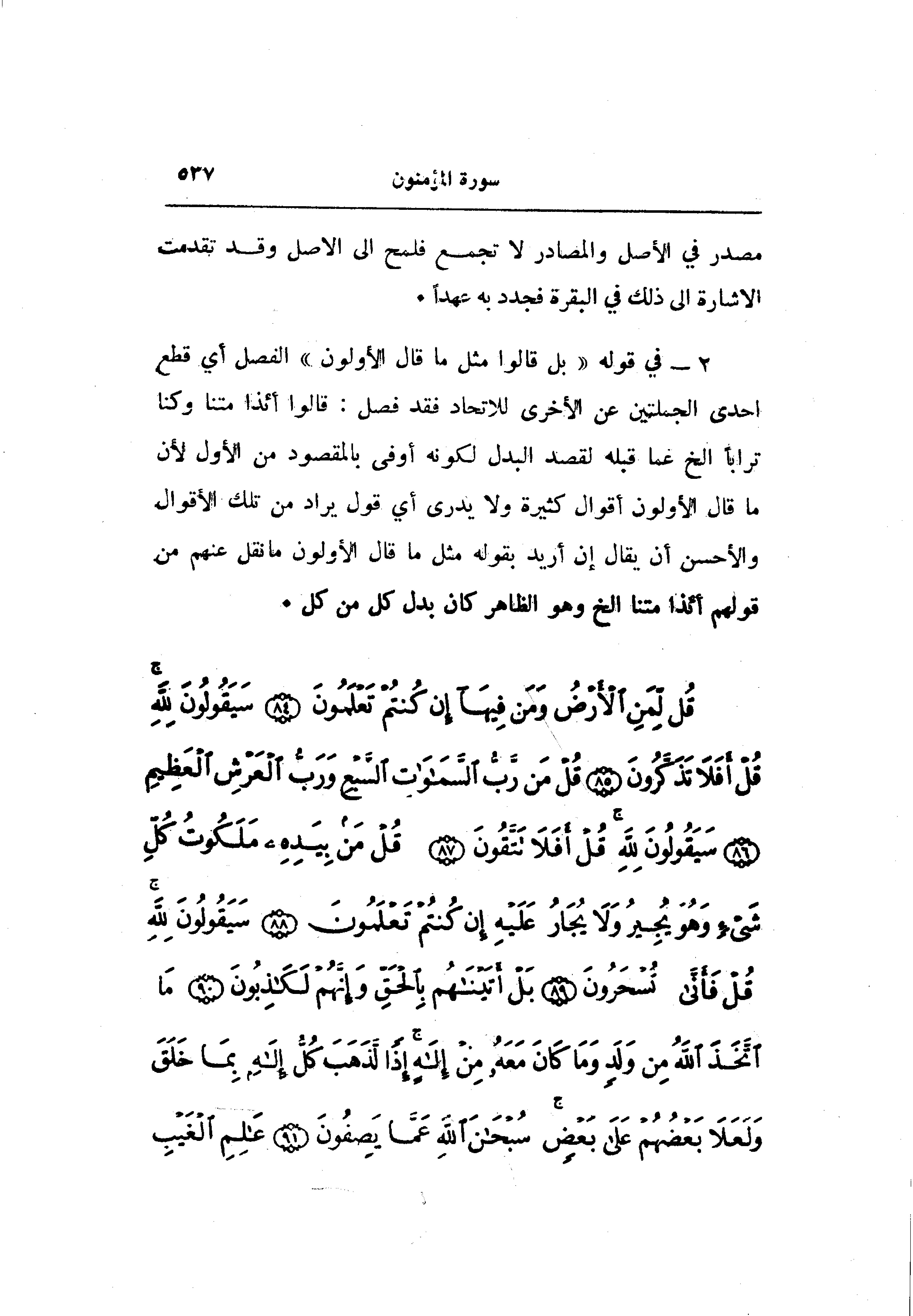 2- في قوله «بل قالوا مثل ما قال الأولون» الفصل أي قطع احدى الجملتين عن الأخرى للاتحاد فقد فصل: قالوا أئذا متنا وكنا ترابا إلخ غما قبله لقصد البدل لكونه أوفى بالمقصود من لأول لأن ما قال الأولون أقوال كثيرة ولا يدرى أي قول يراد من تلك الأقوال والأحسن أن يقال إن أريد بقوله مثل ما قال الأولون ما نقل عنهم من قولهم أئذا متنا إلخ وهو الظاهر كان بدل كل من كل.