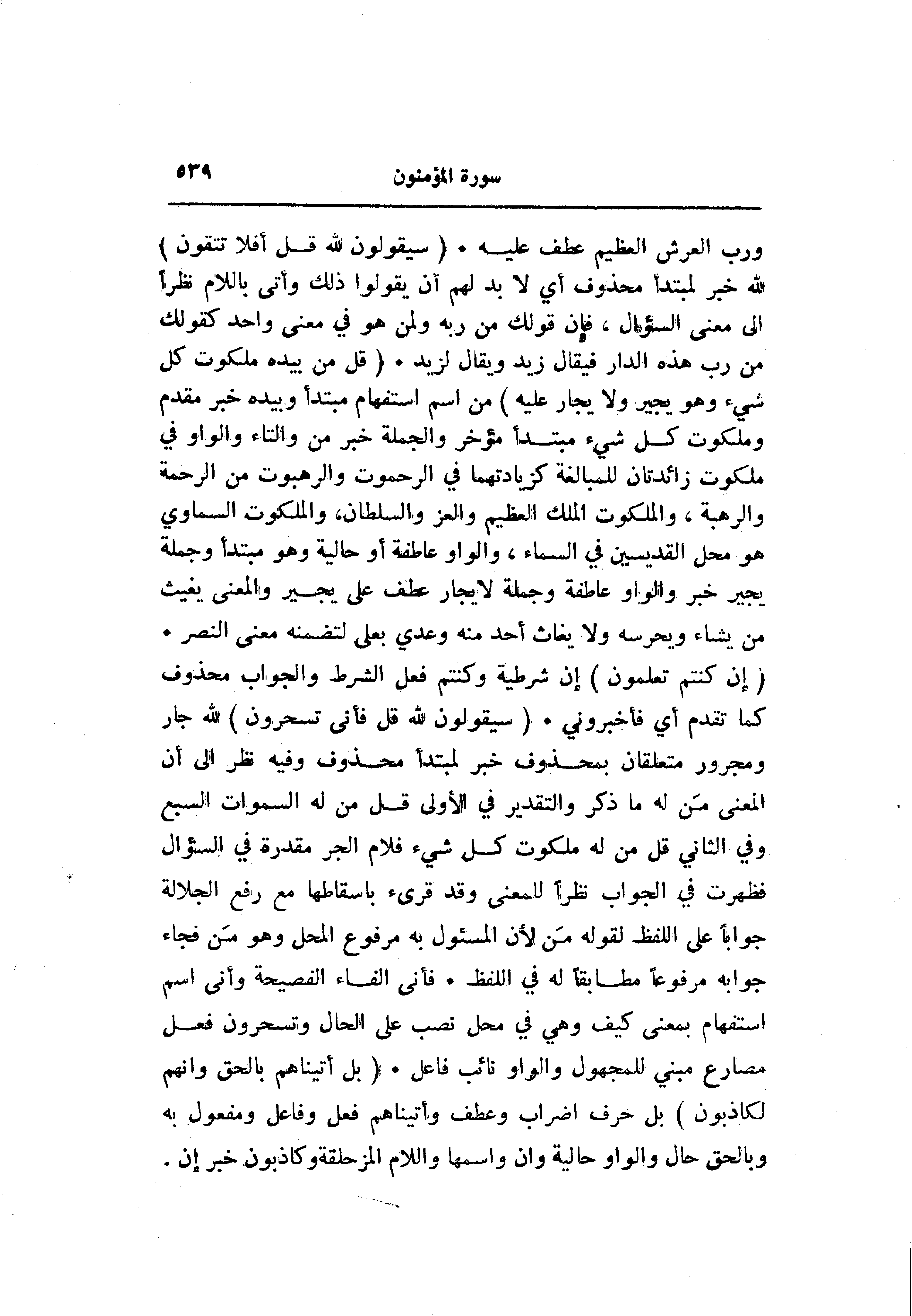 ورب العرش العظيم عطف عليه. (سَيَقُولُونَ لِلَّهِ قُلْ أَفَلا تَتَّقُونَ) لله خبر لمبتدأ محذوف أي لا بد لهم أن يقولوا ذلك وأتى باللام نظرا الى معنى السؤال، فإن قولك من ربه ولمن هو في معنى واحد كقولك من رب هذه الدار فيقال زيد ويقال لزيد. (قُلْ مَنْ بِيَدِهِ مَلَكُوتُ كُلِّ شَيْءٍ وَهُوَ يُجِيرُ وَلا يُجارُ عَلَيْهِ) من اسم استفهام مبتدأ ويده خبر مقدم وملكوت كل شيء مبتدأ مؤخر والجملة خبر من والتاء والواو في ملكوت زائدتان للمبالغة كزيادتهما في الرحموت والرهبوت من الرحمة والرهبة، والملكوت الملك العظيم والعز والسلطان، والملكوت السماوي هو محل القديسين في السماء، والواو عاطفة أو حالية وهو مبتدأ وجملة يجير خبر والواو عاطفة وجملة لا يجار عطف على يجير والمعنى يغيث من يشاء ويحرسه ولا يغاث أحد منه وعدي بعلى لتضمنه معنى النصر.