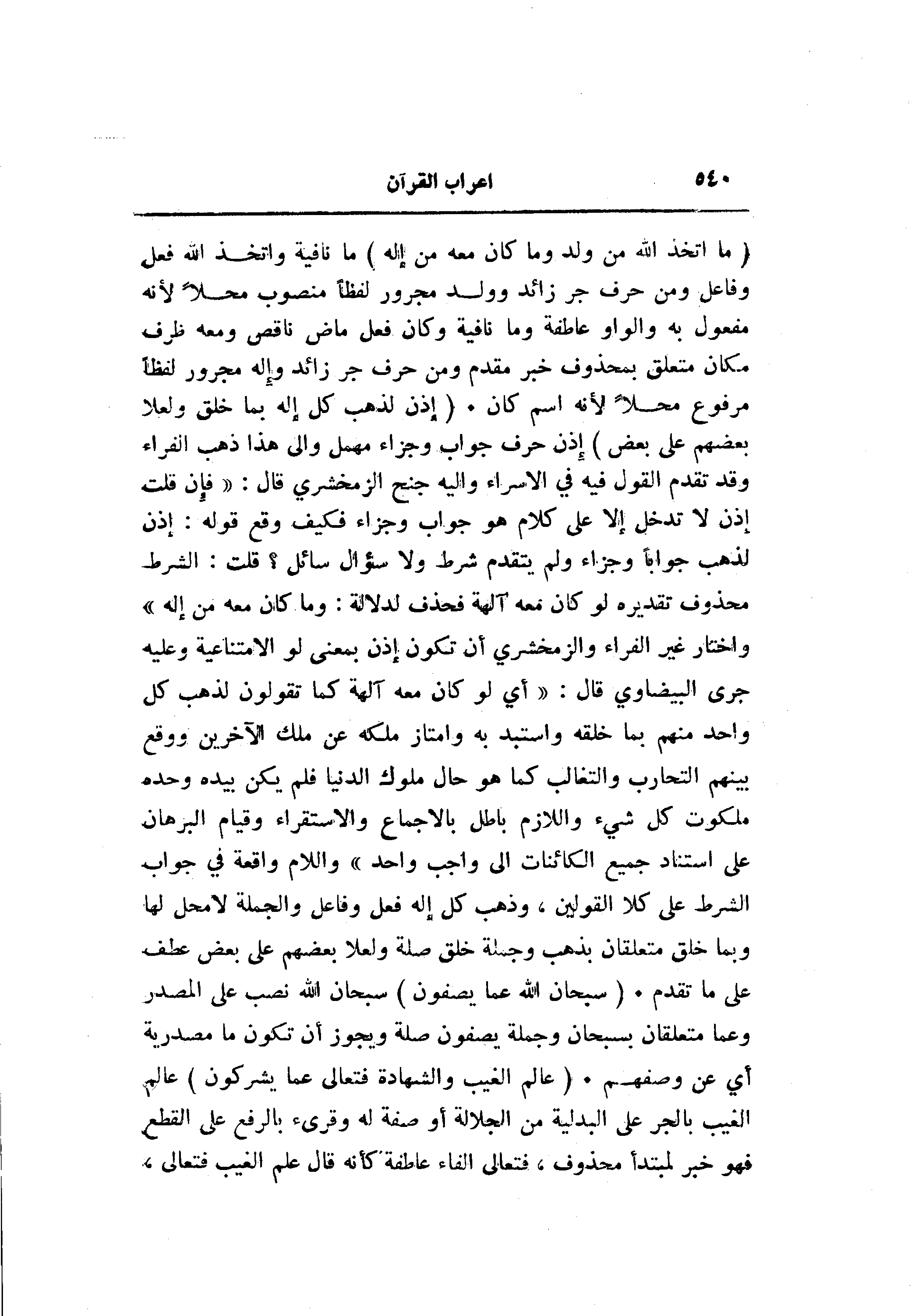 (مَا اتَّخَذَ اللَّهُ مِنْ وَلَدٍ وَما كانَ مَعَهُ مِنْ إِلهٍ) ما نافية واتخذ الله فعل وفاعل ومن حرف جر زائد وولد مجرور لفظا منصوب محلا لأنه مفعول به والواو عاطفة وما نافية وكان فعل ماض ناقص ومعه ظرف مكان متعلق بمحذوف خبر مقدم ومن حرف جر زائد وإله مجرور لفظا مرفوع محلا لأنه اسم كان. (إِذاً لَذَهَبَ كُلُّ إِلهٍ بِما خَلَقَ وَلَعَلا بَعْضُهُمْ عَلى بَعْضٍ) إذن حرف جواب وجزاء مهمل والى هذا ذهب الفراء وقد تقدم القول فيه في الاسراء واليه جنح الزمخشري قال: «فإن قلت إذن لا تدخل إلا على كلام هو جواب وجزاء فكيف وقع قوله: إذن لذهب جوابا وجزاء ولم يتقدم شرط ولا سؤال سائل؟ قلت: الشرط محذوف تقديره لو كان معه آلهة فحذف لدلالة: وما كان معه من إله» واختار غير الفراء والزمخشري أن تكون إذن بمعنى لو الامتناعية وعليه جرى البيضاوي قال: «أي لو كان معه آلهة كما تقولون لذهب كل واحد منهم بما خلقه واستبد به وامتاز ملكه عن ملك الآخرين ووقع بينهم التحارب والتغالب كما هو حال ملوك الدنيا فلم يكن بيده وحده ملكوت كل شيء واللازم باطل بالإجماع والاستقراء وقيام البرهان على استناد جميع الكائنات الى واجب واحد» واللام واقعة في جواب الشرط على كلا القولين، وذهب كل إله فعل وفاعل والجملة لا محل لها وبما خلق متعلقان بذهب وجملة خلق صلة ولعلا بعضهم على بعض عطف على ما تقدم. (سُبْحانَ اللَّهِ عَمَّا يَصِفُونَ) سبحان الله نصب على المصدر وعما متعلقان بسبحان وجملة يصفون صلة ويجوز أن تكون ما مصدرية أي عن وصفهم. (عالِمِ الْغَيْبِ وَالشَّهادَةِ فَتَعالى عَمَّا يُشْرِكُونَ) عالم الغيب بالجر على البدلية من الجلالة أو صفة له وقرىء بالرفع على القطع فهو خبر لمبتدأ محذوف، فتعالى الفاء عاطفة كأنه قال علم الغيب فتعالى،