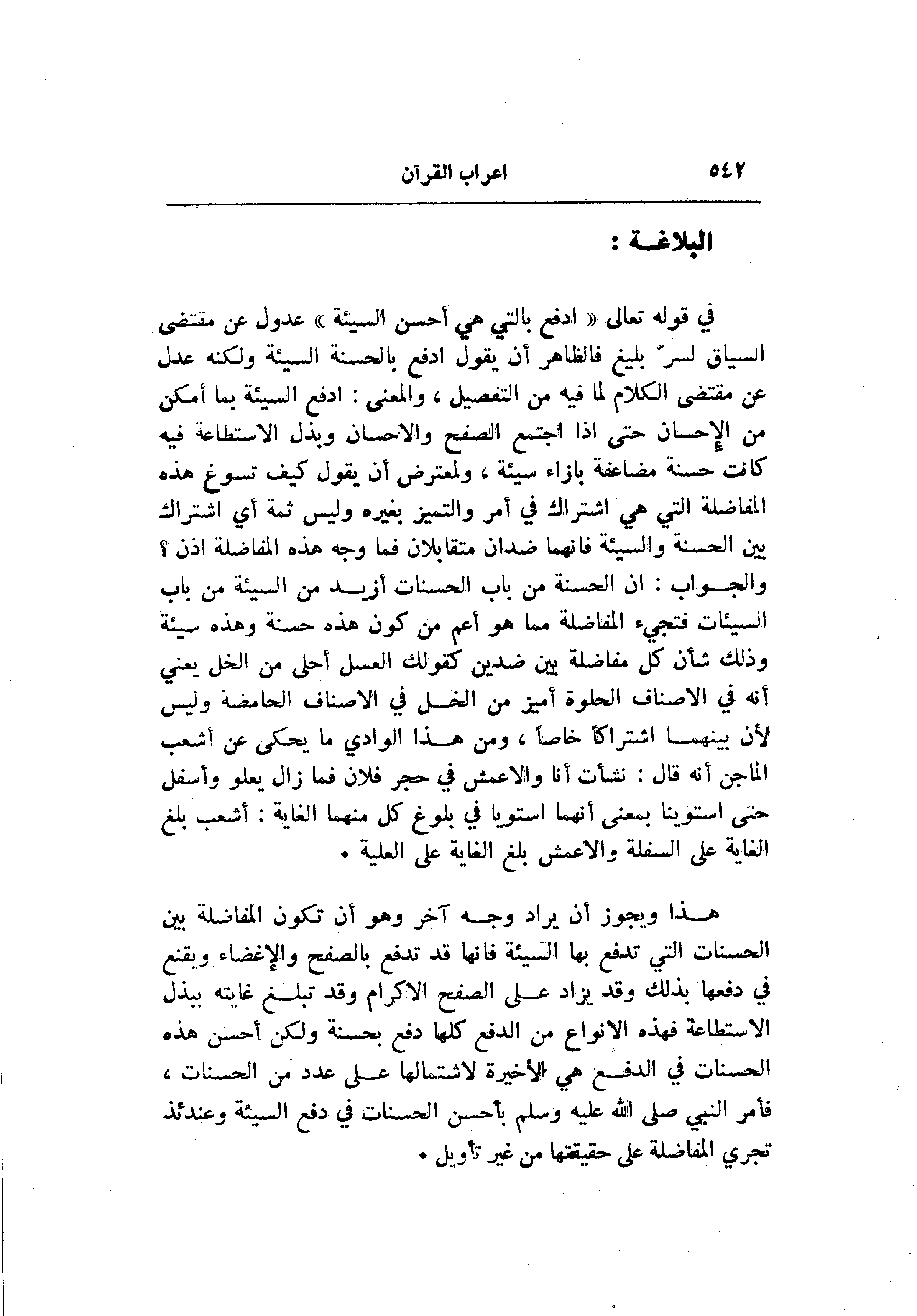 في قوله تعالى «ادْفَعْ بِالَّتِي هِيَ أَحْسَنُ السَّيِّئَةَ» عدول عن مقتضى السياق لسرّ بليغ فالظاهر أن يقول ادفع بالحسنة السيئة ولكنه عدل عن مقتضى الكلام لما فيه من التفصيل، والمعنى: ادفع السيئة بما أمكن من الإحسان حتى إذا اجتمع الصفح والإحسان وبذل الاستطاعة فيه كانت حسنة مضاعفة بإزاء سيئة، ولمعترض أن يقول كيف تسوغ هذه المفاضلة التي هي اشتراك في أمر والتميز بغيره وليس ثمة أي اشتراك بين الحسنة والسيئة فانهما ضدان متقابلان فما وجه هذه المفاضلة اذن؟