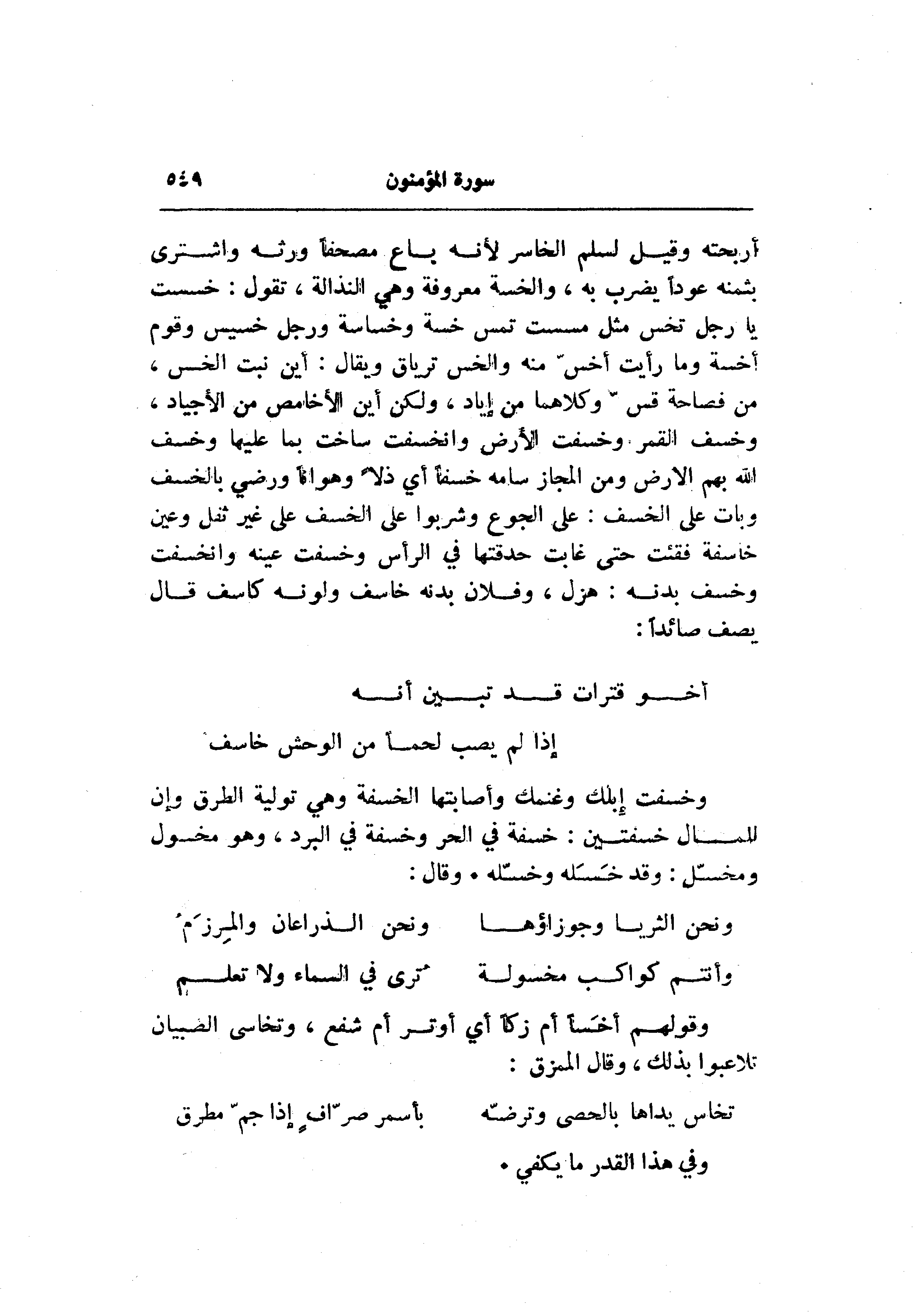 أربحته وقيل لسلم الخاسر لأنه باع مصحفا ورثه واشترى بثمنه عودا يضرب به، والخسة معروفة وهي النذالة، تقول: خسست يا رجل تخس مثل مسست تمس خسة وخساسة ورجل خسيس وقوم أخسة وما رأيت أخسّ منه والخس ترياق ويقال: أين نبت الخس، من فصاحة قسّ وكلاهما من إياد، ولكن أين الأخامص من الأجياد، وخسف القمر وخسفت الأرض وانخسفت ساخت بما عليها وخسف الله بهم الأرض ومن المجاز سامه خسفا أي ذلا وهوانا ورضي بالخسف وبات على الخسف: على الجوع وشربوا على الخسف على غير ثقل وعين خاسفة فقئت حتى غابت حدقتها في الرأس وخسفت عينه وانخسفت وخسف بدنه: هزل، وفلان بدنه خاسف ولونه كاسف قال يصف صائدا: