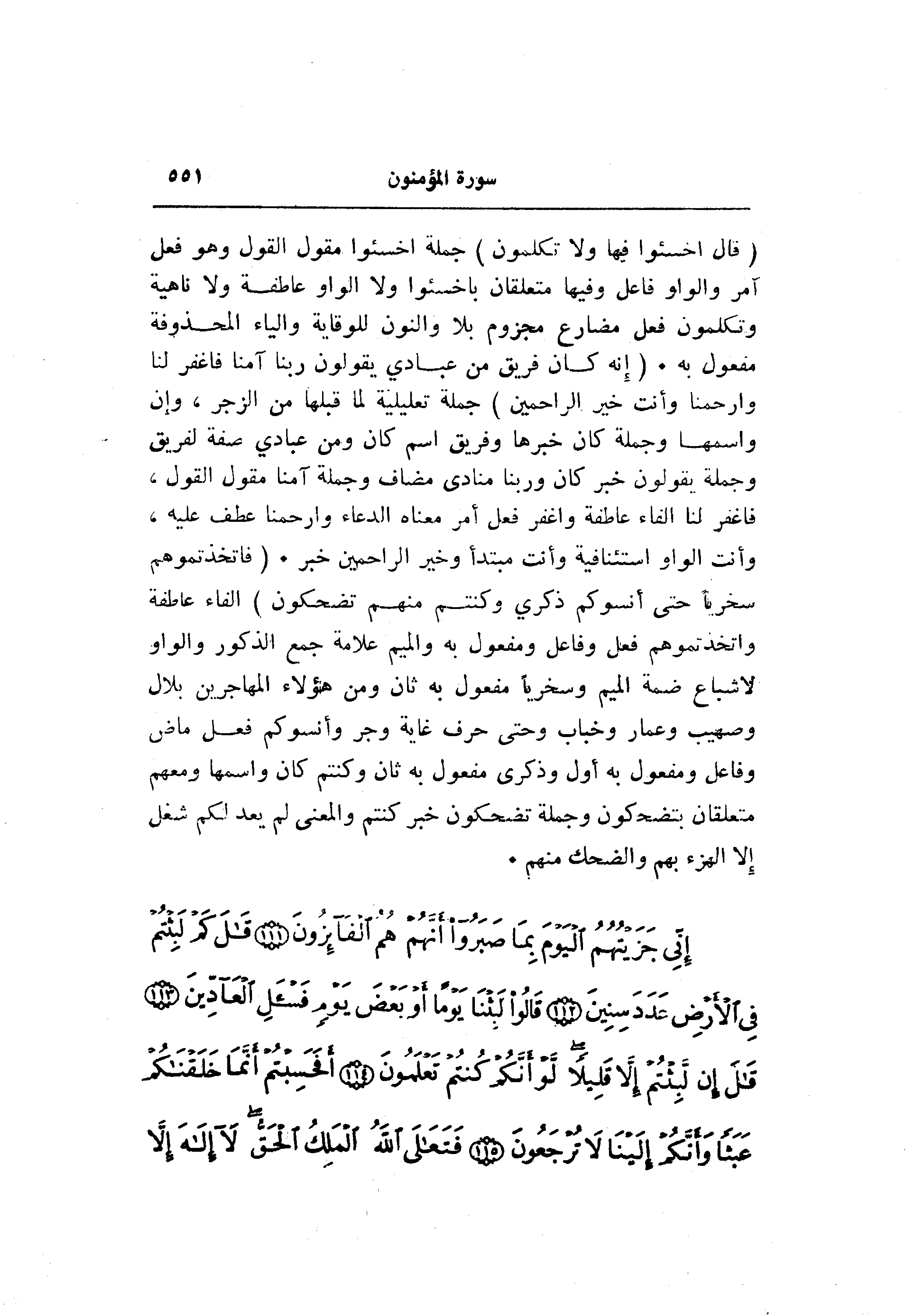 (قالَ اخْسَؤُا فِيها وَلا تُكَلِّمُونِ) جملة اخسئوا مقول القول وهو فعل آمر والواو فاعل وفيها متعلقان باخسئوا ولا الواو عاطفة ولا ناهية وتكلمون فعل مضارع مجزوم بلا والنون للوقاية والياء المحذوفة مفعول به. (إِنَّهُ كانَ فَرِيقٌ مِنْ عِبادِي يَقُولُونَ رَبَّنا آمَنَّا فَاغْفِرْ لَنا وَارْحَمْنا وَأَنْتَ خَيْرُ الرَّاحِمِينَ) جملة تعليلية لما قبلها من الزجر، وإن واسمها وجملة كان خبرها وفريق اسم كان ومن عبادي صفة لفريق وجملة يقولون خبر كان وربنا منادى مضاف وجملة آمنا مقول القول، فاغفر لنا الفاء عاطفة واغفر فعل أمر معناه الدعاء وارحمنا عطف عليه، وأنت الواو استئنافية وأنت مبتدأ وخير الراحمين خبر. (فَاتَّخَذْتُمُوهُمْ سِخْرِيًّا حَتَّى أَنْسَوْكُمْ ذِكْرِي وَكُنْتُمْ مِنْهُمْ تَضْحَكُونَ) الفاء عاطفة واتخذتموهم فعل وفاعل ومفعول به والميم علامة جمع الذكور والواو لاشباع ضمة الميم وسخريا مفعول به ثان ومن هؤلاء المهاجرين بلال وصهيب وعمار وخباب وحتى حرف غاية وجر وأنسوكم فعل ماض وفاعل ومفعول به أول وذكرى مفعول به ثان وكنتم كان واسمها ومعهم متعلقان بتضحكون وجملة تضحكون خبر كنتم والمعنى لم يعد لكم شغل إلا الهزء بهم والضحك منهم.