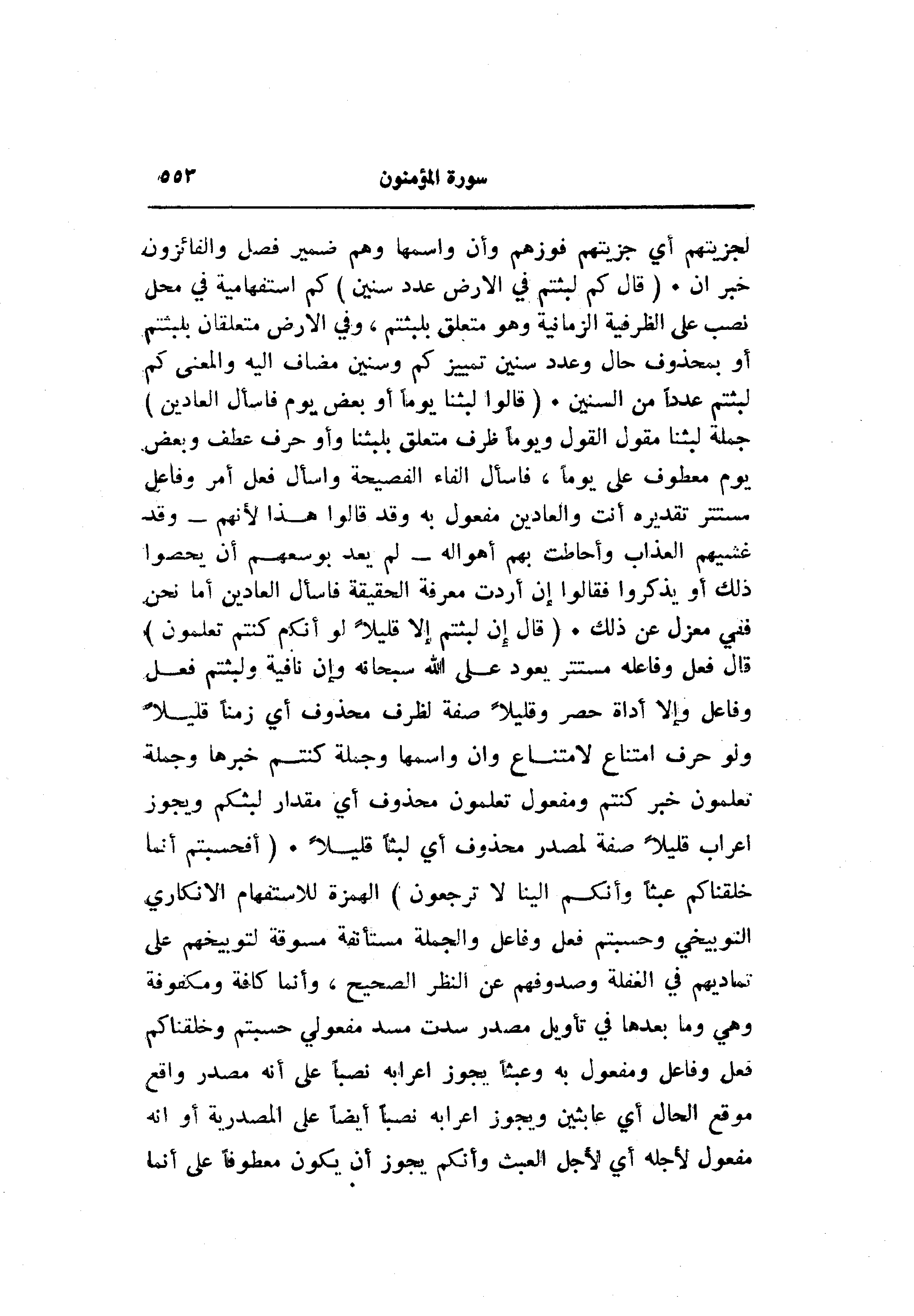 لجزيتهم أي جزيتهم فوزهم وأن واسمها وهم ضمير فصل والفائزون خبر ان. (قالَ كَمْ لَبِثْتُمْ فِي الْأَرْضِ عَدَدَ سِنِينَ) كم استفهامية في محل نصب على الظرفية الزمانية وهو متعلق بلبثتم، وفي الأرض متعلقان بلبثتم أو بمحذوف حال وعدد سنين تمييز كم وسنين مضاف اليه والمعنى كم لبثتم عددا من السنين. (قالُوا لَبِثْنا يَوْماً أَوْ بَعْضَ يَوْمٍ فَسْئَلِ الْعادِّينَ) جملة لبثنا مقول القول ويوما ظرف متعلق بلبثنا وأو حرف عطف وبعض يوم معطوف على يوما، فاسأل الفاء الفصيحة واسأل فعل أمر وفاعل مستتر تقديره أنت والعادين مفعول به وقد قالوا هذا لأنهم- وقد غشيهم العذاب وأحاطت بهم أهواله- لم يعد بوسعهم أن يحصوا ذلك أو يذكروا فقالوا إن أردت معرفة الحقيقة فاسأل العادين أما نحن ففي معزل عن ذلك. (قالَ إِنْ لَبِثْتُمْ إِلَّا قَلِيلًا لَوْ أَنَّكُمْ كُنْتُمْ تَعْلَمُونَ) قال فعل وفاعله مستتر يعود على الله سبحانه وإن نافية ولبثتم فعل وفاعل وإلا أداة حصر وقليلا صفة لظرف محذوف أي زمنا قليلا ولو حرف امتناع لامتناع وان واسمها وجملة كنتم خبرها وجملة تعلمون خبر كنتم ومفعول تعلمون محذوف أي مقدار لبثكم ويجوز اعراب قليلا صفة لمصدر محذوف أي لبثا قليلا. (أَفَحَسِبْتُمْ أَنَّما خَلَقْناكُمْ عَبَثاً وَأَنَّكُمْ إِلَيْنا لا تُرْجَعُونَ) الهمزة للاستفهام الانكاري التوبيخي وحسبتم فعل وفاعل والجملة مستأنفة مسوقة لتوبيخهم على تماديهم في الغفلة وصدوفهم عن النظر الصحيح، وأنما كافة ومكفوفة وهي وما بعدها في تأويل مصدر سدت مسد مفعولي حسبتم وخلقناكم فعل وفاعل ومفعول به وعبثا يجوز إعرابه نصبا على أنه مصدر واقع موقع الحال أي عابثين ويجوز إعرابه نصبا أيضا على المصدرية أو انه مفعول لأجله أي لأجل العبث وأنكم يجوز أن يكون معطوفا على أنما