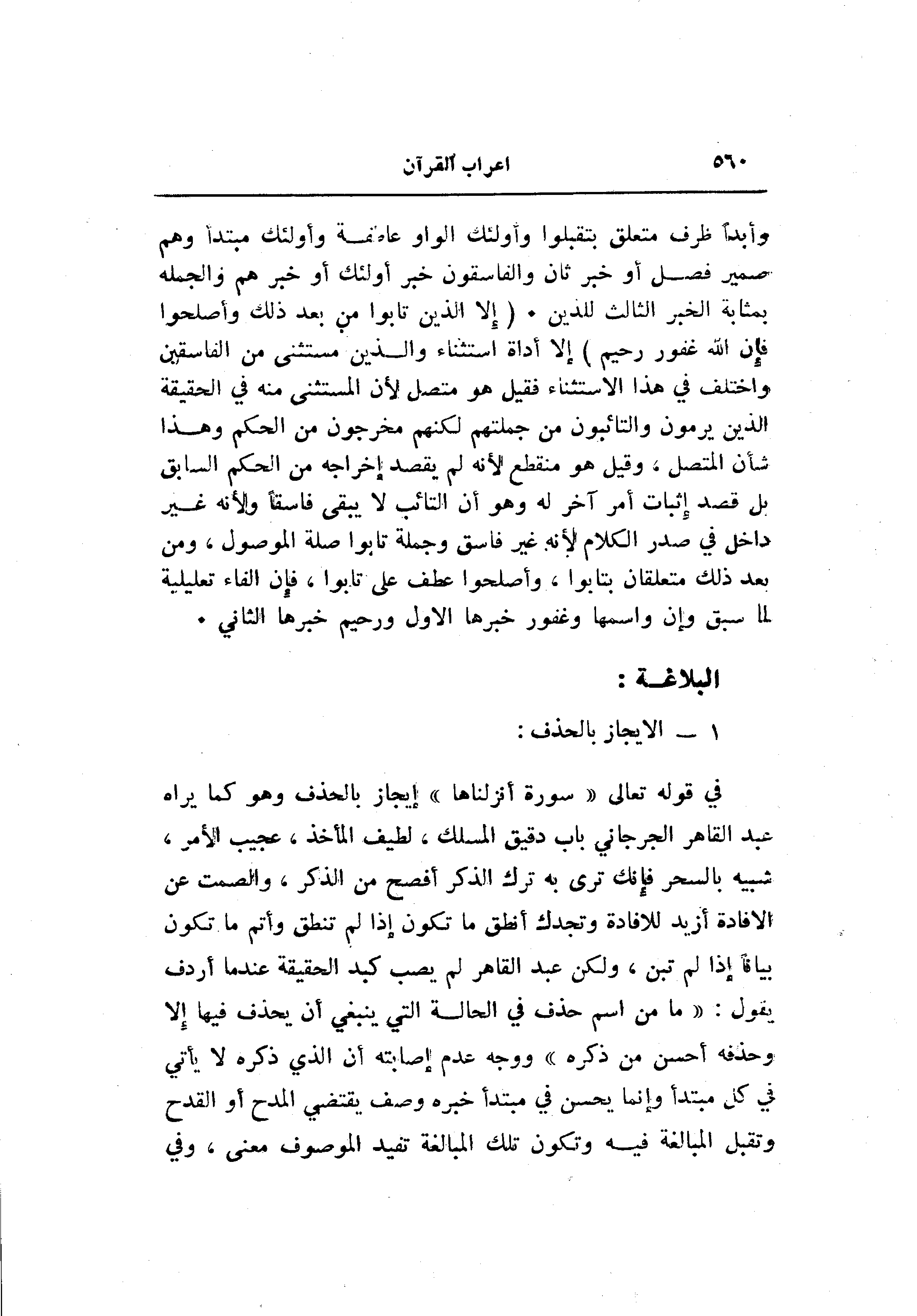 في قوله تعالى «سُورَةٌ أَنْزَلْناها» إيجاز بالحذف وهو كما يراه عبد القاهر الجرجاني باب دقيق المسلك، لطيف المأخذ، عجيب الأمر، شبيه بالسحر فإنك ترى به ترك الذكر أفصح من الذكر، والصمت عن الافادة أزيد للافادة وتجدك أنطق ما تكون إذا لم تنطق وأتم ما تكون بيانا إذا لم تبن، ولكن عبد القاهر لم يصب كبد الحقيقة عند ما أردف يقول: «ما من اسم حذف في الحالة التي ينبغي أن يحذف فيها إلا وحذفه أحسن من ذكره» ووجه عدم إصابته أن الذي ذكره لا يأتي في كل مبتدأ وإنما يحسن في مبتدأ خبره وصف يقتضي المدح أو القدح وتقبل المبالغة فيه وتكون تلك المبالغة تفيد الموصوف معنى، وفي