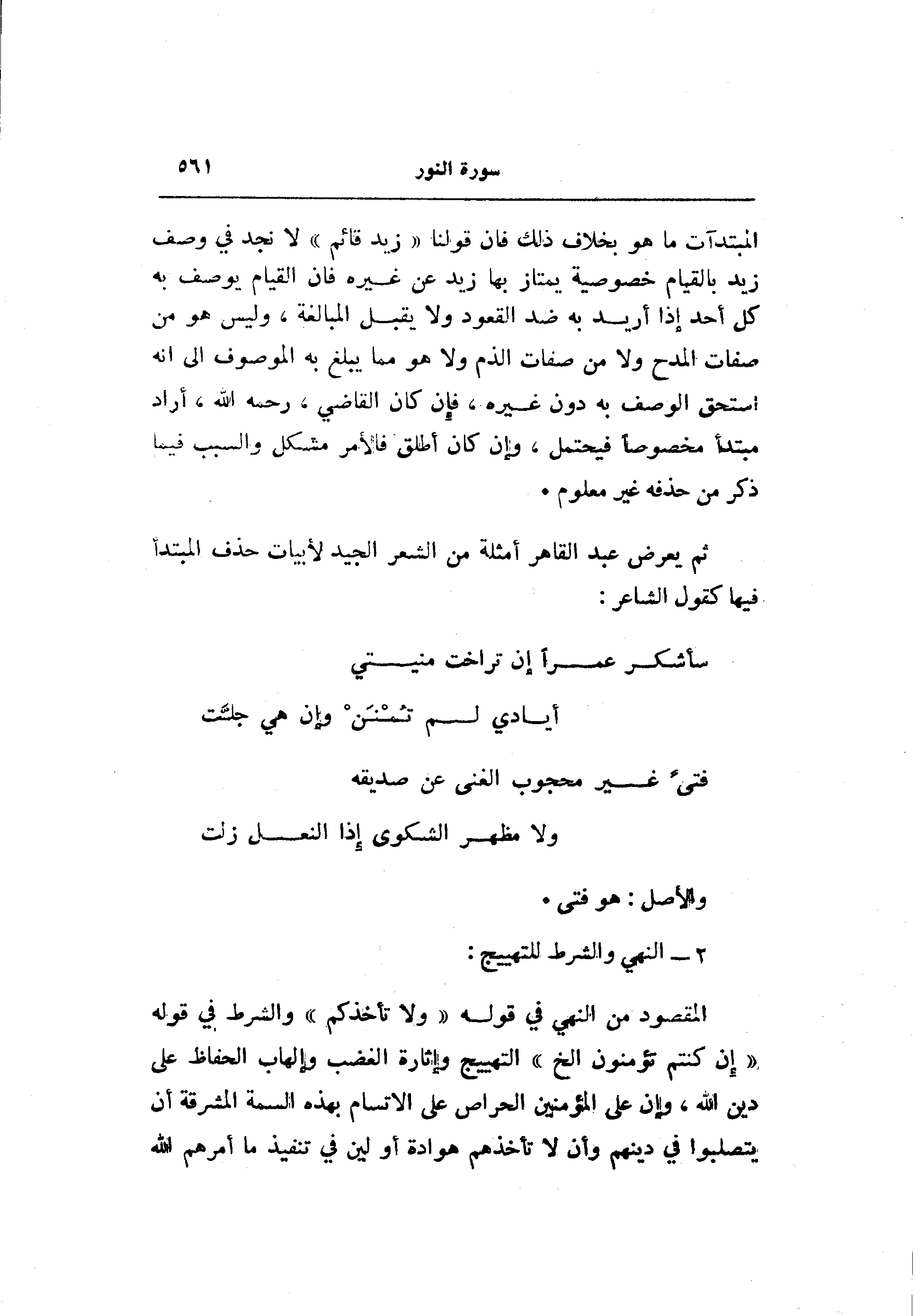 ثم يعرض عبد القاهر أمثلة من الشعر الجيد لأبيات حذف المبتدأ فيها كقول الشاعر: