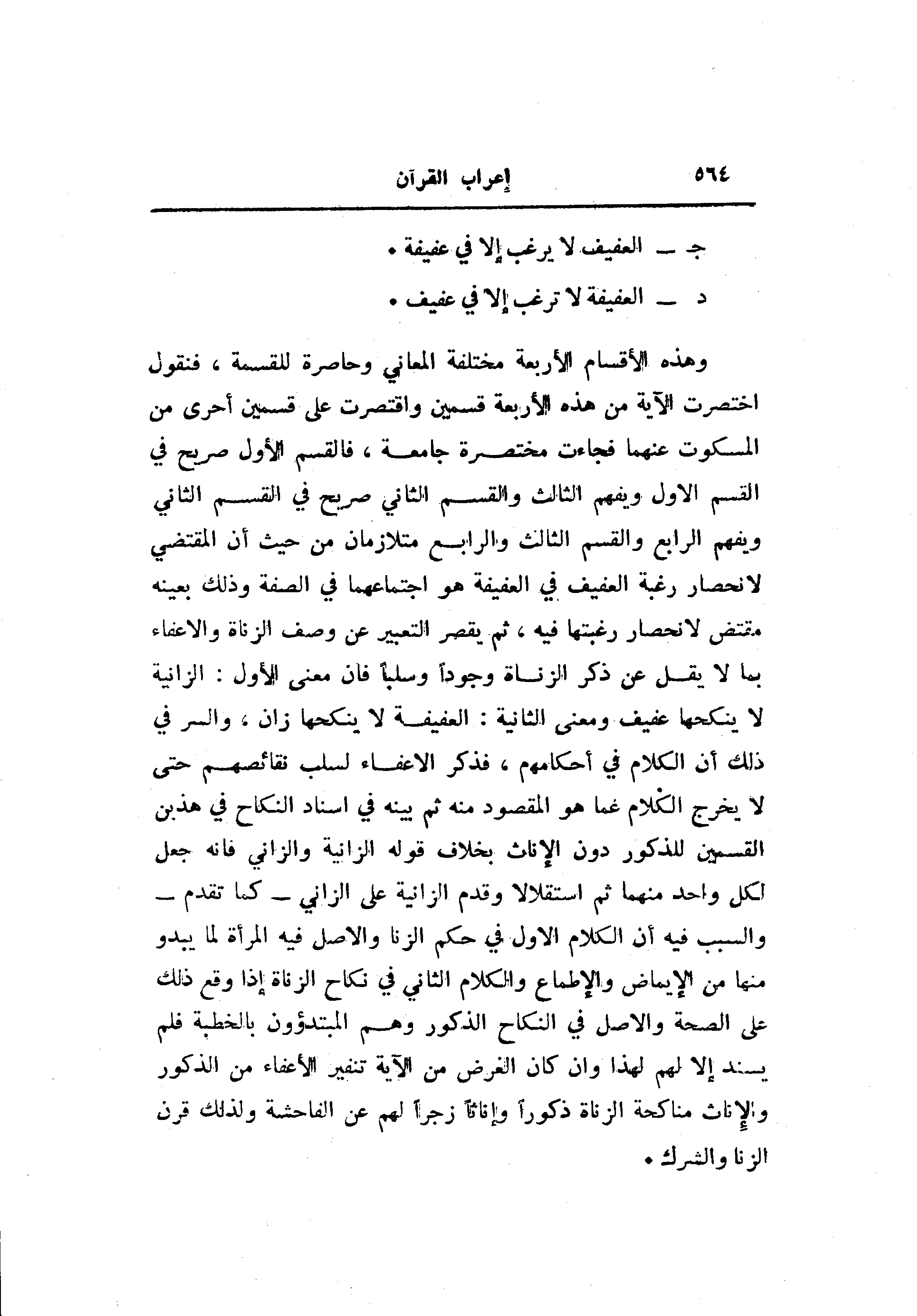 وهذه الأقسام الأربعة مختلفة المعاني وحاصرة للقسمة، فنقول اختصرت الآية من هذه الأربعة قسمين واقتصرت على قسمين أحرى من المسكوت عنهما فجاءت مختصرة جامعة، فالقسم الأول صريح في القسم الاول ويفهم الثالث والقسم الثاني صريح في القسم الثاني ويفهم الرابع والقسم الثالث والرابع متلازمان من حيث أن المقتضي لانحصار رغبة العفيف في العفيفة هو اجتماعهما في الصفة وذلك بعينه مقتض لانحصار رغبتها فيه، ثم يقصر التعبير عن وصف الزناة والإعفاء بما لا يقل عن ذكر الزناة وجودا وسلبا فان معنى الأول: الزانية لا ينكحها عفيف ومعنى الثانية: العفيفة لا ينكحها زان، والسر في ذلك أن الكلام في أحكامهم، فذكر الإعفاء لسلب نقائصهم حتى لا يخرج الكلام عما هو المقصود منه ثم بينه في اسناد النكاح في هذين القسمين للذكور دون الإناث بخلاف قوله الزانية والزاني فانه جعل لكل واحد منهما ثم استقلالا وقدم الزانية على الزاني- كما تقدم- والسبب فيه أن الكلام الاول في حكم الزنا والأصل فيه المرأة لما يبدو منها من الإيماض والإطماع والكلام الثاني في نكاح الزناة إذا وقع ذلك على الصحة والأصل في النكاح الذكور وهم المبتدءون بالخطبة فلم يسند إلا لهم لهذا وان كان الغرض من الآية تنفير الأعفاء من الذكور والإناث مناكحة الزناة ذكورا وإناثا زجرا لهم عن الفاحشة ولذلك قرن الزنا والشرك.