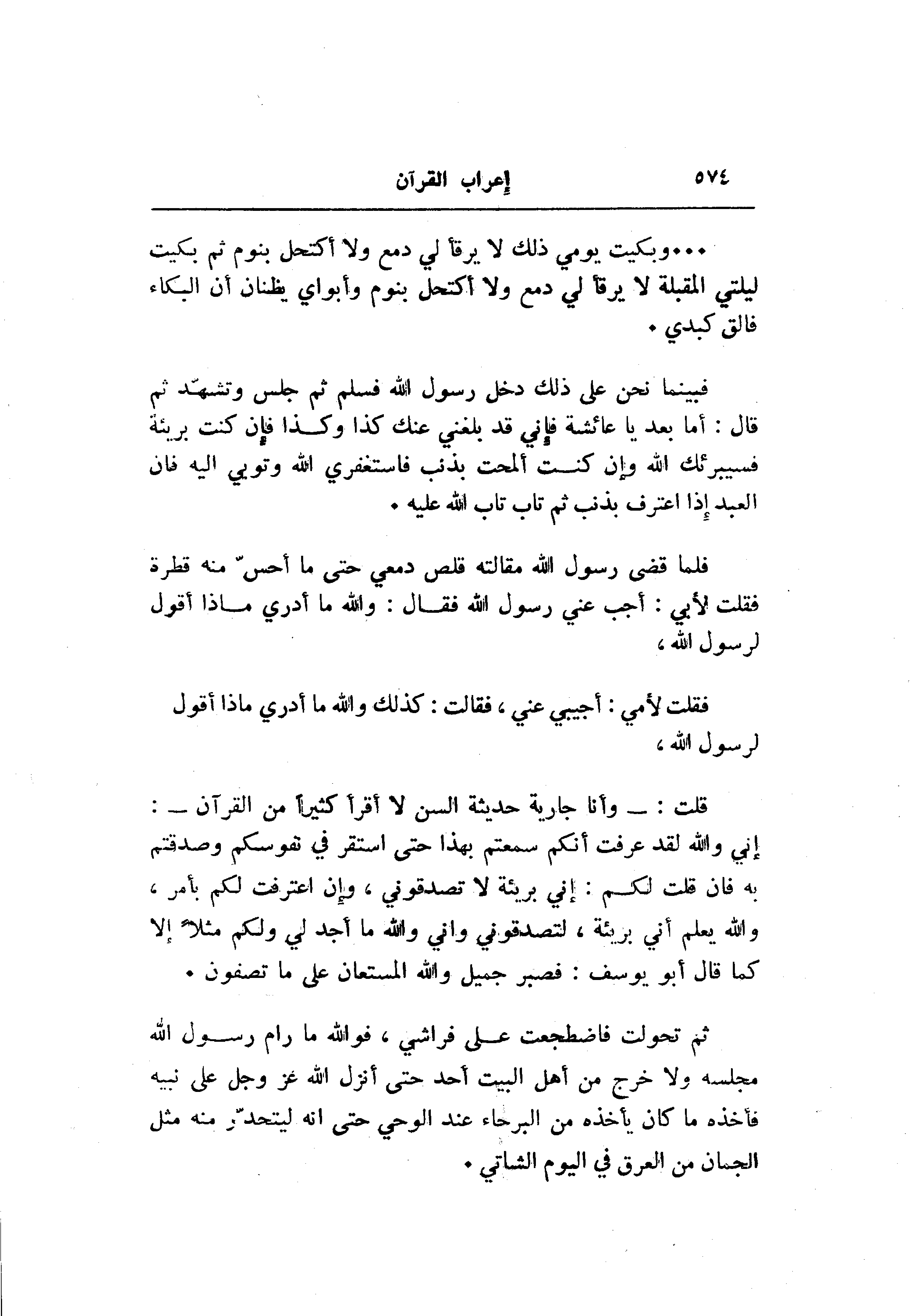 فلما قضى رسول الله مقالته قلص دمعي حتى ما أحسّ منه قطرة فقلت لأبي: أجب عني رسول الله فقال: والله ما أدري ماذا أقول لرسول الله، فقلت لأمي: أجيبي عني، فقالت: كذلك والله ما أدري ماذا أقول لرسول الله، قلت:- وأنا جارية حديثة السن لا أقرأ كثيرا من القرآن-: