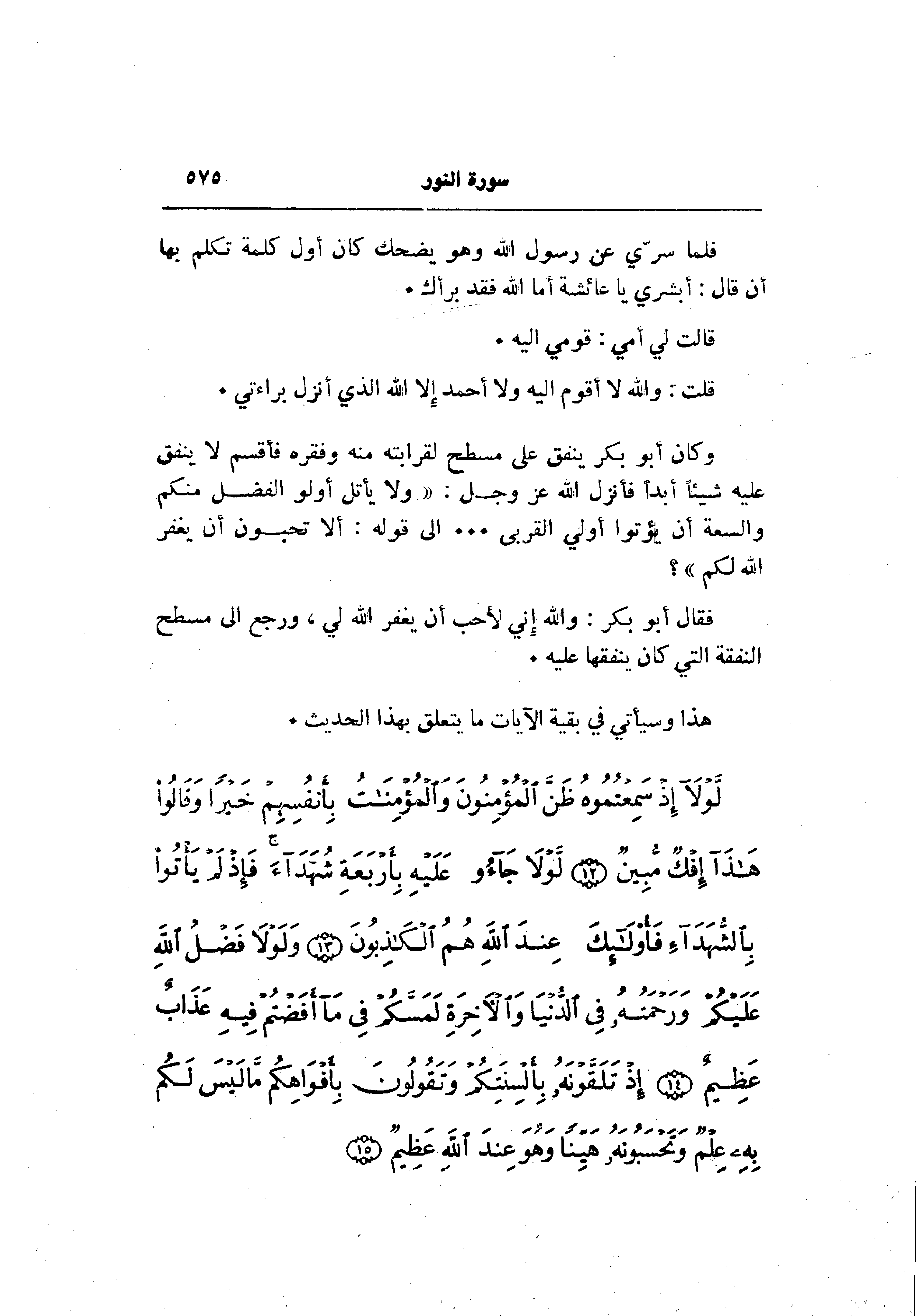 قلت: والله لا أقوم اليه ولا أحمد إلا الله الذي أنزل براءتي.