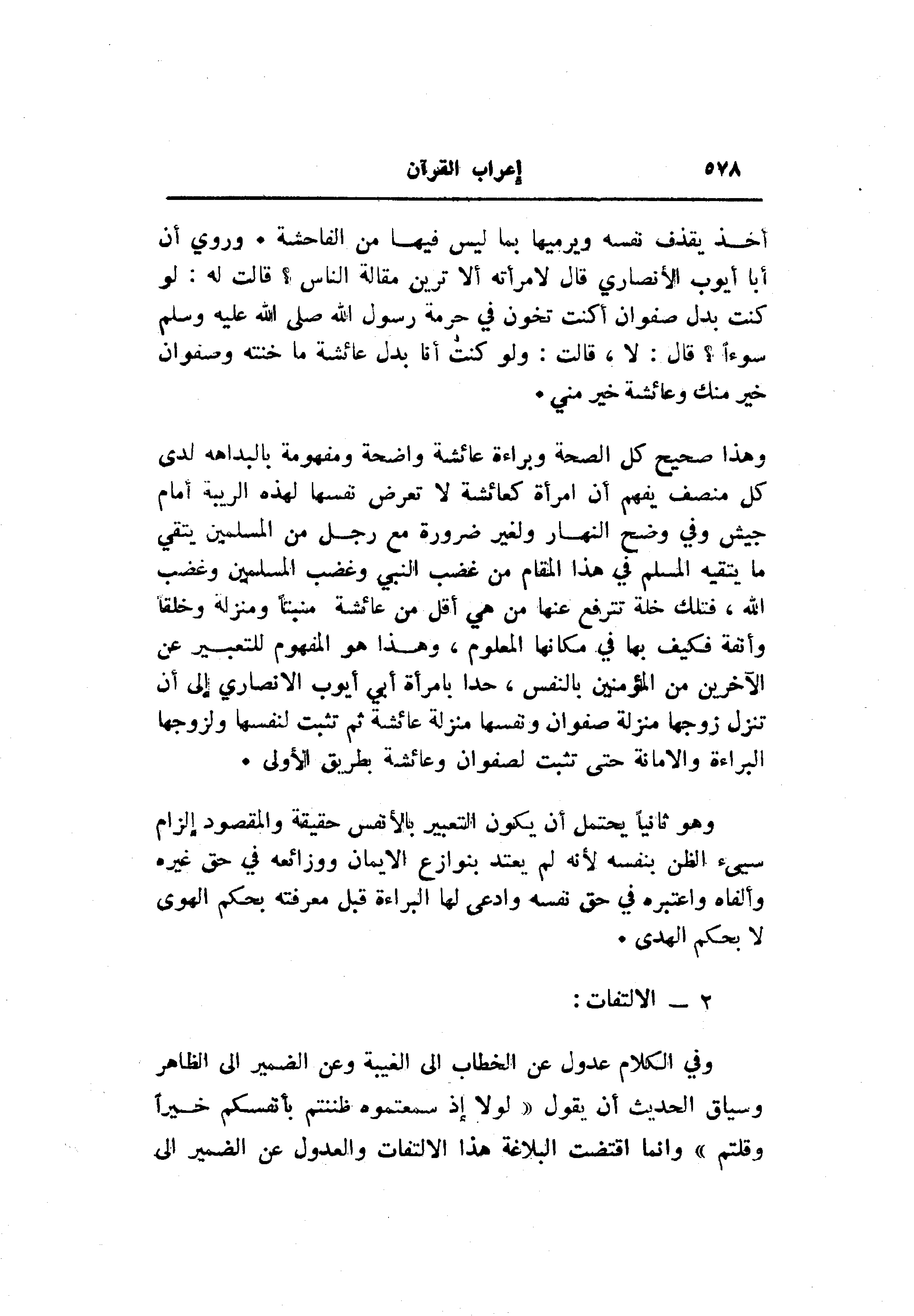 وفي الكلام عدول عن الخطاب الى الغيبة وعن الضمير الى الظاهر وسياق الحديث أن يقول «لولا إذ سمعتموه ظننتم بأنفسكم خيرا وقلتم» وانما اقتضت البلاغة هذا الالتفات والعدول عن الضمير الى