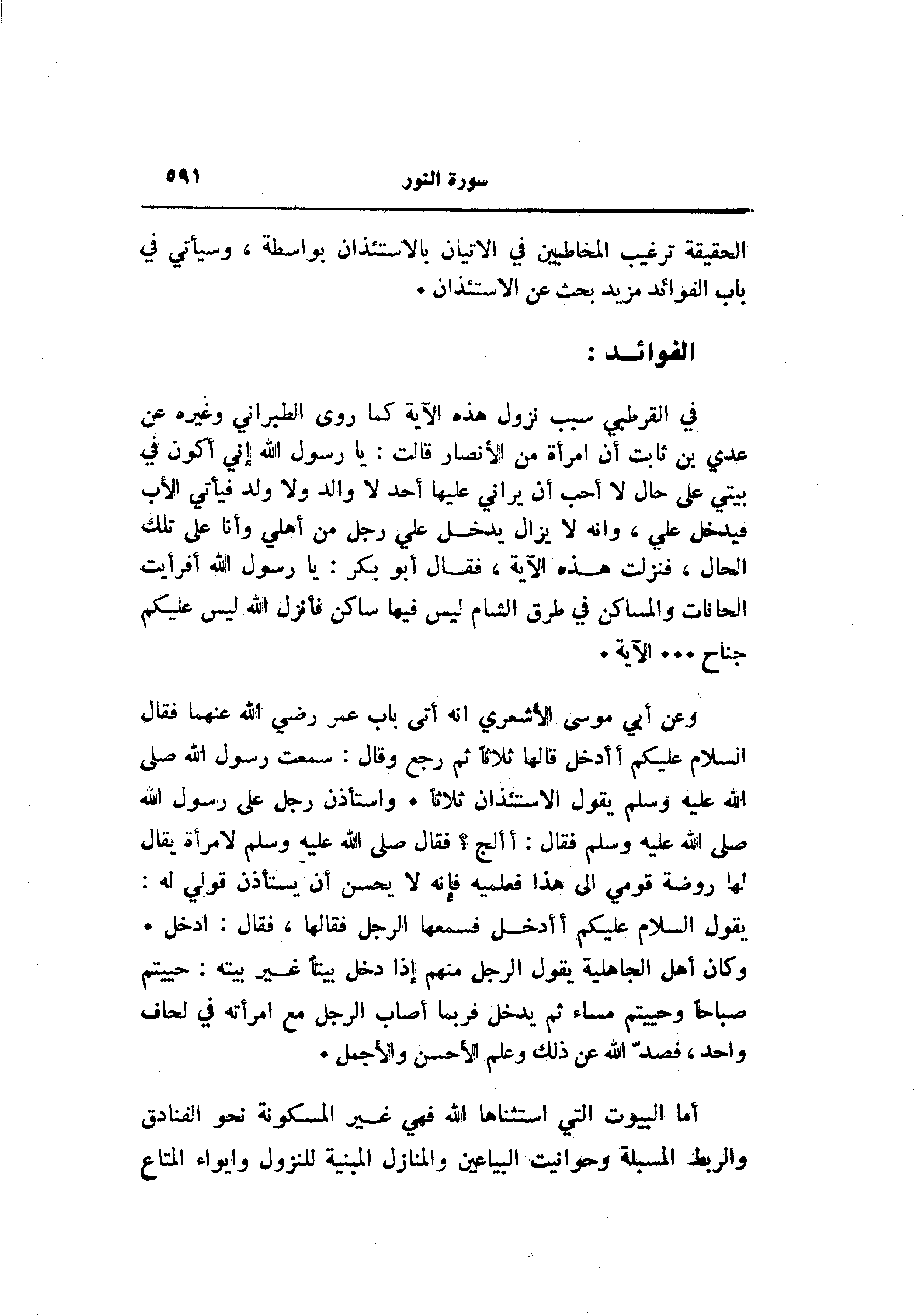في القرطبي سبب نزول هذه الآية كما روى الطبراني وغيره عن عدي بن ثابت أن امرأة من الأنصار قالت: يا رسول الله إني أكون في بيتي على حال لا أحب أن يراني عليها أحد لا والد ولا ولد فيأتي الأب فيدخل علي، وانه لا يزال يدخل علي رجل من أهلي وأنا على تلك الحال، فنزلت هذه الآية، فقال أبو بكر: يا رسول الله أفرأيت الخانات والمساكن في طرق الشام ليس فيها ساكن فأنزل الله ليس عليكم جناح ... الآية.