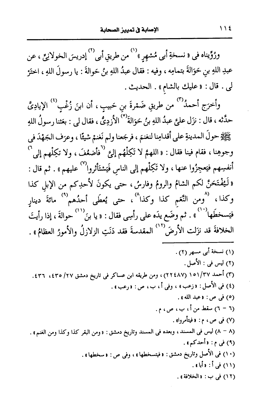 ورويناه في نسخة أبي مسهر من طريق أبي إدريس الخولاني، عَن عَبد الله ابن حوالة بتمامه وفيه فقال عَبد الله ابن حوالة يا رسول الله اختر لي قال عليك بالشام ...الحديث.
