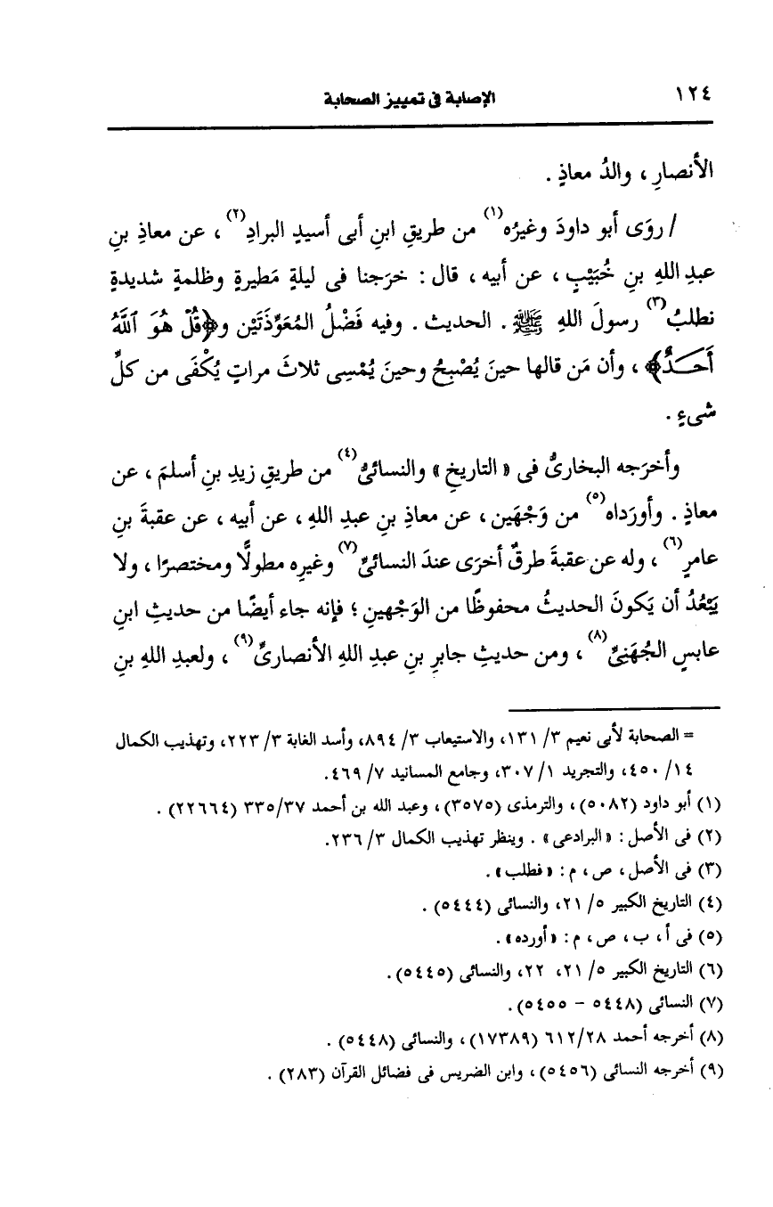 وأَخرجه البُخارِيّ في التاريخ والنسائي من طريق زيد بن أسلم، عَن معاذ وأورده من وجهين، عَن معاذ بن عَبد الله، عَن أَبيه، عَن عقبة بن عامر وله، عَن عقبة طرق أخرى عند النسائي وغيره مطولا ومختصرا ولا يبعد أن يكون الحديث محفوظا من الوجهين فإنه جاء أيضًا من حديث بن عابس الجهني ومن حديث جابر بن عَبد الله، الأَنصارِيّ ولعبد الله بن خبيب عند البغوي حديث آخر بسند ضعيف.