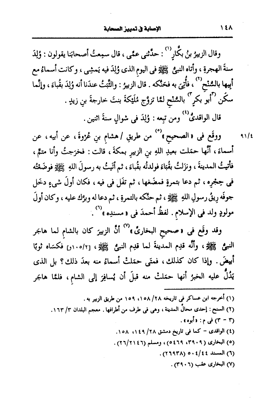 وقد وقع في صحيح البُخارِيّ أن الزبير كان بالشام لما هاجر النَّبيّ صَلى الله عَلَيه وسَلم وأنه قدم المدينة لما قدم النَّبيّ صَلى الله عَلَيه وسَلم فكساه ثوبا أبيض وإذا كان كذلك فمتى حملت أسماء منه بعد ذلك بل الذي يدل عليه الخبر أنها حملت منه قبل أن يسافر إلى الشام فلما هاجر النَّبيّ صَلى الله عَلَيه وسَلم إلى المدينة وتبعه أصحابه أرسالا خرجت أسماء بنت أبي بكر بعد أن هاجر النَّبيّ صَلى الله عَلَيه وسَلم بأشهر فإن كان قدومها في شوال محفوظا فتكون سنة إحدى.