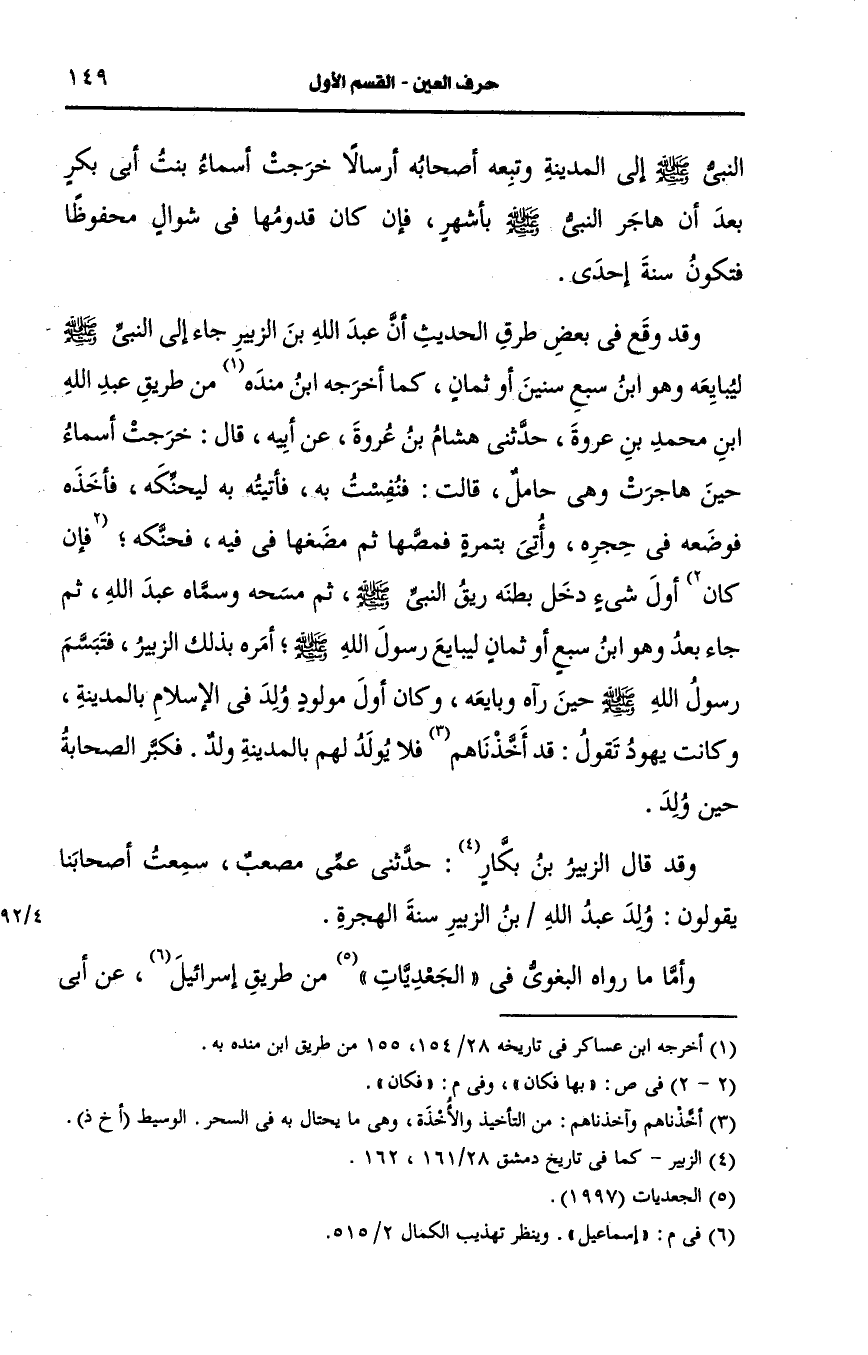 وقد قال الزبير بن بكار حدثني عمي مصعب سمعت أصحابنا يقولون ولد عَبد الله بن الزبير سنة الهجرة وأما ما رواه البغوي في الجعديات من طريق إسماعيل، عَن أبي إسحاق عمن حدثه، عَن أبي بكر أنه طاف بعبد الله بن الزبير في خرقة وهو أول مولود ولد في الإسلام فقد ذكر ابن سَعد أن الواقدي أنكره وقال هذا غلط بين فلا اختلاف بين المسلمين إنه أول مولود ولد بعد الهجرة ومكة يومئذ حرب لم يدخلها النَّبيّ صَلى الله عَلَيه وسَلم حينئذ ولا أحد من المسلمين.
