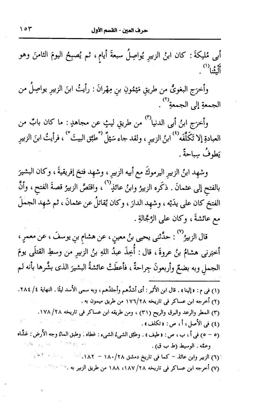 وأخرج ابن أبي الدنيا من طريق ليث، عَن مجاهد ما كان باب من العبادة إلا تكلفه ابن الزبير. ولقد جاء سيل بالبيت فرأيت ابن الزبير يطوف سباحة.