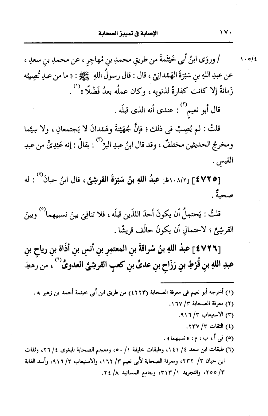 4726- عَبد الله بن سراقة بن المعتمر بن أنس بن أذاة بن رياح بن عَبد الله بن قرط بن رزاح بن عَدِيّ بن كعب، القُرشِيّ العدوي من رهط عمر.