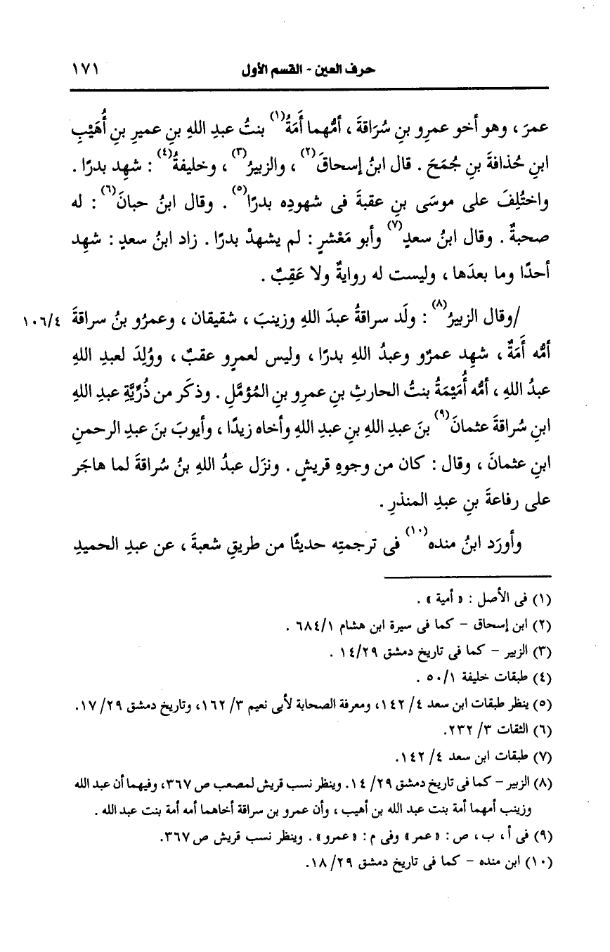وذكر من ذرية عَبد الله بن سراقة عَمرو بن عَبد الله وأخاه زيدا وأيوب بن عبد الرحمن بن عثمان وقال كان من وجوه قريش ونزل عَبد الله بن سراقة لما هاجر على رفاعة بن عبد المنذر.