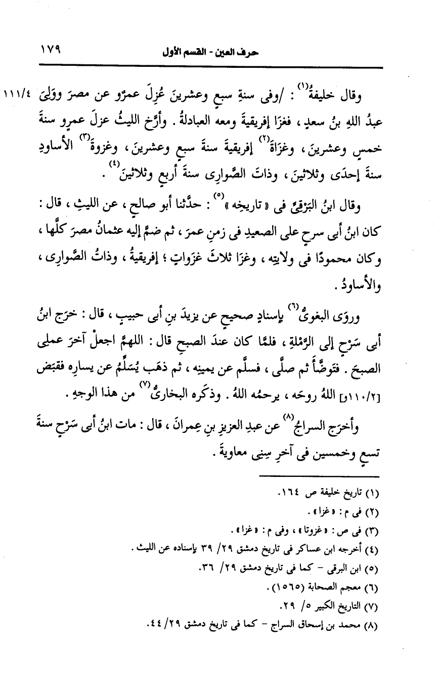 وقال ابن البرقي، في "تاريخه"، حَدَّثنا أَبو صالح، عَن الليث، قال: كان ابن أبي سرح على الصعيد في زمن عمر ثم ضم إليه عثمان مصر كلها، وكان محمودا في ولايته وغزا ثلاث غزوات إفريقية وذات الصواري والأساود.