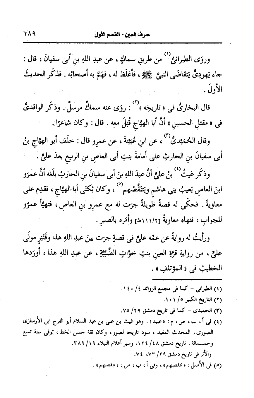 وذكر عبيد بن علي أن عَبد الله بن أبي سفيان بن الحارث بلغه أن عَمرو بن العاص يعيب بني هاشم ويتنقصهم، وكان، يُكنى أَبا الهياج فقدم على معاوية فحكى له قصة طويلة جرت له مع عَمرو بن العاص فتهيأ عَمرو للجواب فنهاه معاوية وأمره بالصبر.