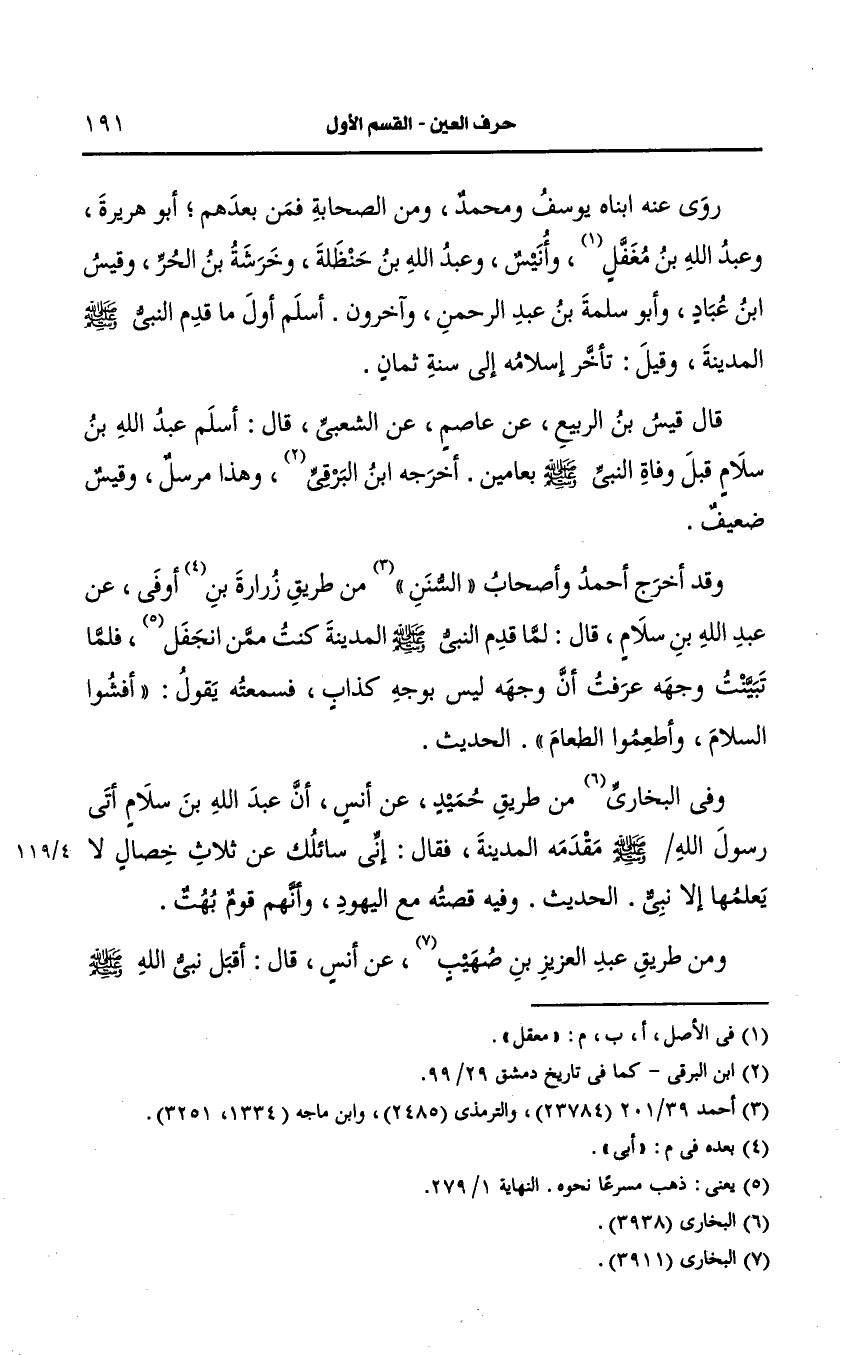 ومن طريق عبد العزيز بن صهيب، عَن أنس قال أقبل نبي الله صَلى الله عَلَيه وسَلم إلى المدينة فاستشرفوا ينظرون إليه فسمع به عَبد الله بن سلام وهو في نخل لأهله فعجل وجاء فسمع من نبي الله صَلى الله عَلَيه وسَلم فقال أشهد أنك رسول الله حقا وأنك جئت بحق ولقد علمت أني سيدهم وأعلمهم فاسألهم عني قبل أن يعلموا بإسلامي ...الحديث.