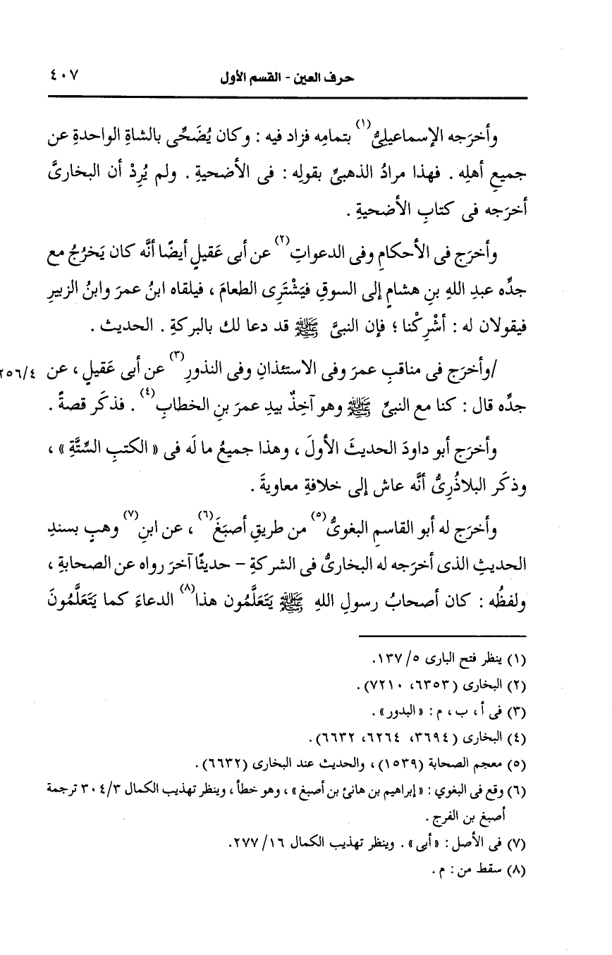 وأَخرجه الإسماعيلي بتمامه فزاد فكان يضحى بالشاة الواحدة، عَن جميع أهله فهذا مراد الذهبي بقوله في الأضحية ولم يرد أن البُخارِيّ أَخرجه في كتاب الأضحية.