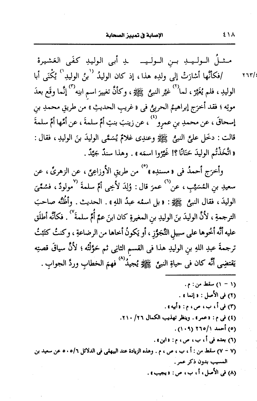 وأخرج أَحمد في مسنده من طريق الأوزاعي، عَن الزُّهْرِيّ، عَن سعيد بن المسيب، عَن ابن عمر قال ولد لأخي أُم سَلَمة فكأنه أطلق عليه أنه أخوها على سبيل التجوز أو يكون أخاها من الرضاعة وكنت كتبت ترجمة عَبد الله بن الوليد هذا في القسم الثاني ثم حولته لأن سياق قصته يقتضي أنه كان في حياة النَّبيّ صَلى الله عَلَيه وسَلم يجيد فهم الخطاب ورد الجواب.