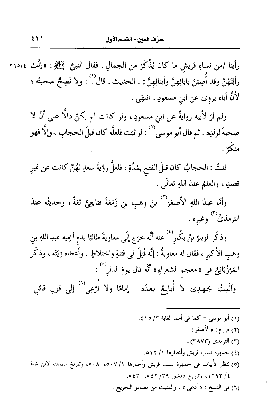 ولم أر لأبيه رواية، عَن ابن مسعود ولو كانت لم تكن دالة على أن لا صحبة لولده ثم قال أَبو موسى لو ثبت فلعله كان قبل الحجاب وإلا فهو منكر.