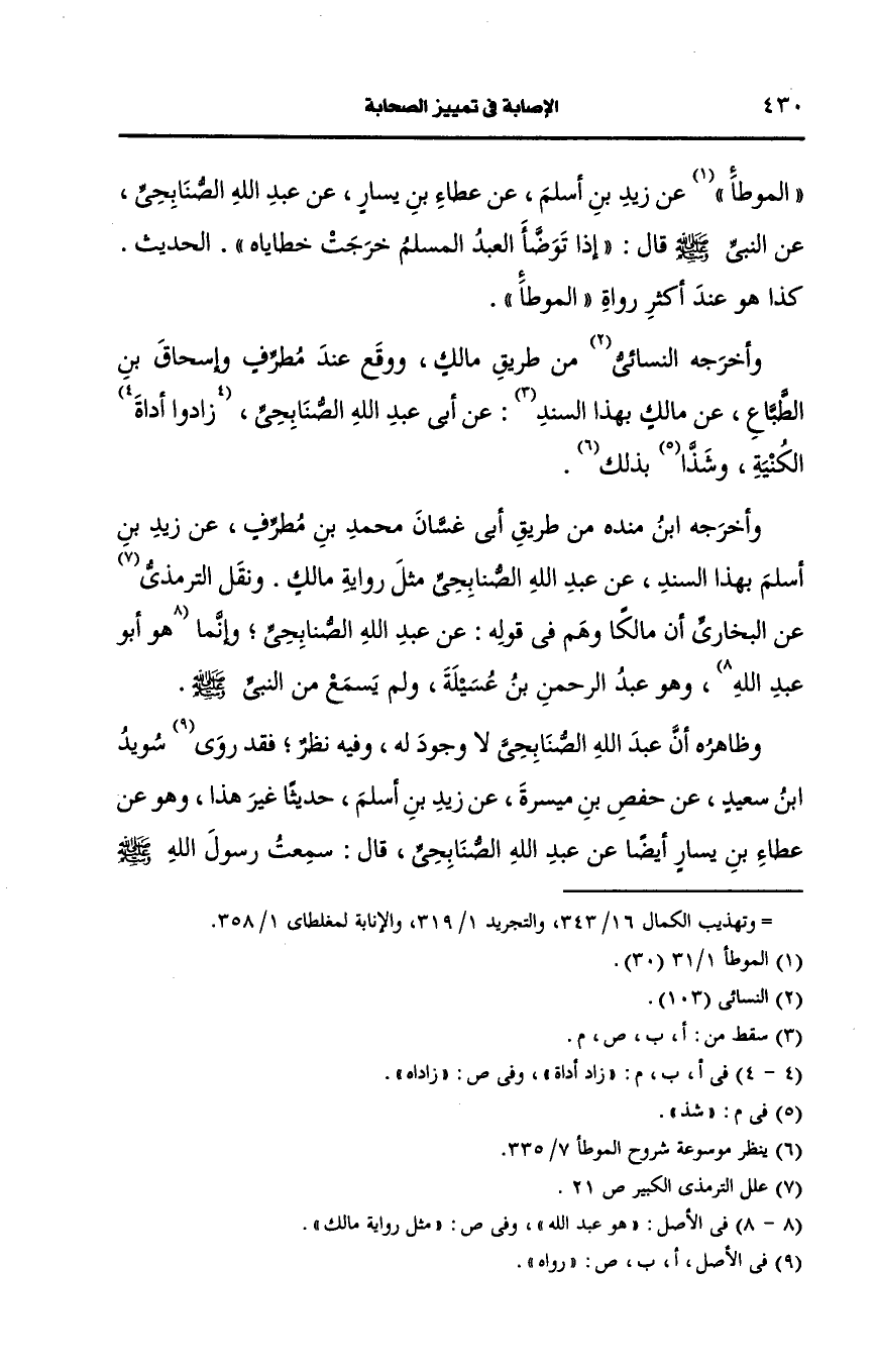 وأَخرجه النسائي من طريق مالك ووقع عند مطرف وإسحاق بن الطباع، عَن مالك بهذا، عَن أبي عَبد الله الصنابحي زاد أداة الكنية وشذ بذلك.