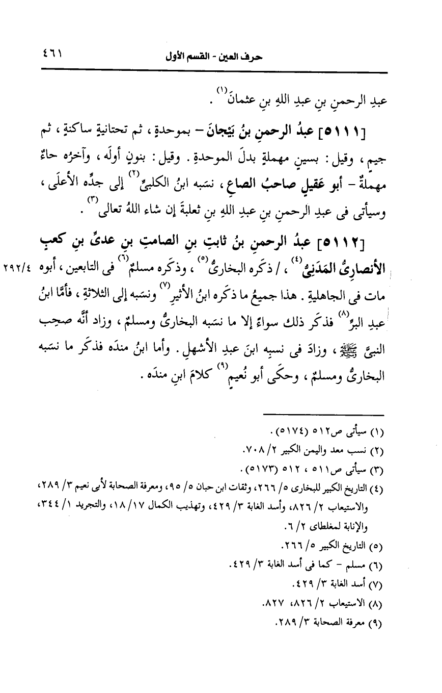5111- (ز) عبد الرحمن بن بيجان بموحدة ثم تحتانية ساكنة ثم جيم وقيل بسين مهملة بدل الموحدة، وقيل: ابنون أوله وآخره حاء مهملة أَبو عقيل صاحب الصاع.