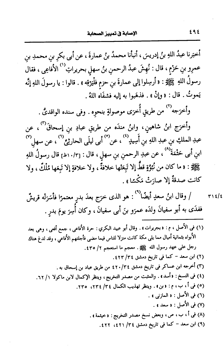 وقال ابنُ سَعْد أيضًا هو الذي خرج بعد بدر معتمرا فأسرته قريش ففدى به أَبو سفيان ولده عَمرو بن أبي سفيان، وكان أسر يوم بدر.