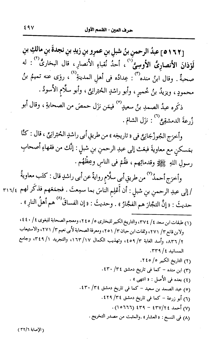 5162- عبد الرحمن بن شبل بن عَمرو بن زيد بن نجدة بن مالك بن لوذان، الأَنصارِيّ الأوسي أحد نقباء الأنصار.