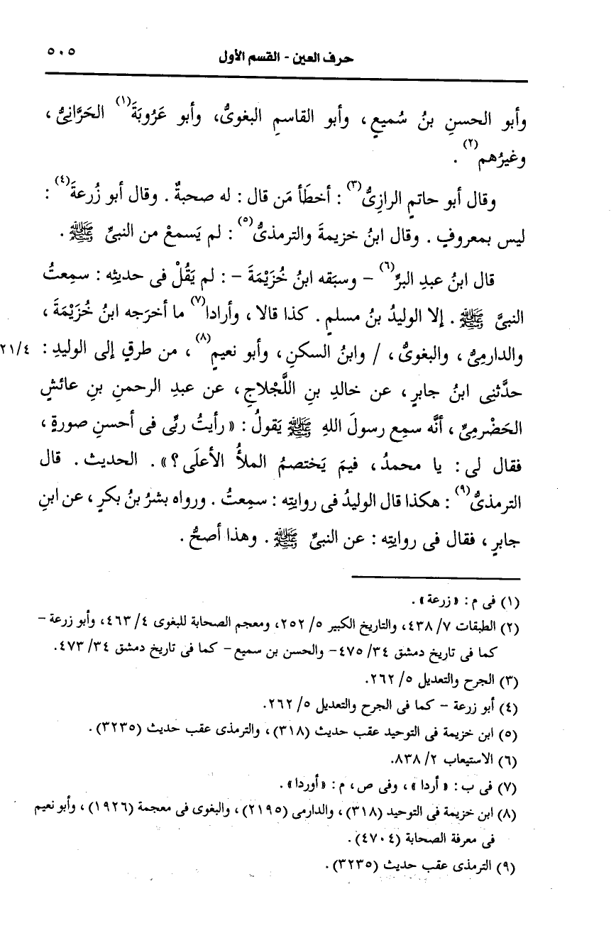 قَالَ ابْنُ عَبْدِ الْبَرِّ: وسبقه بن خزيمة ولم يقل في حديثه سمعت النَّبيّ صَلى الله عَلَيه وسَلم إلا الوليد بن مسلم، كَذا قَالا وأوردا ما أَخرجه ابن خزيمة والدارمي والبغوي، وابن السَّكَن، وأَبو نعيم من طرق إلى الوليد حدثني بن جابر، عَن خالد بن اللجلاج، عَن عبد الرحمن بن عائش الحضرمي أنه سمع رسول الله صَلى الله عَلَيه وسَلم يقول رأيت ربي في أحسن صورة فقال لي يا محمد فيم يختصم الملأ الأعلى ...الحديث.