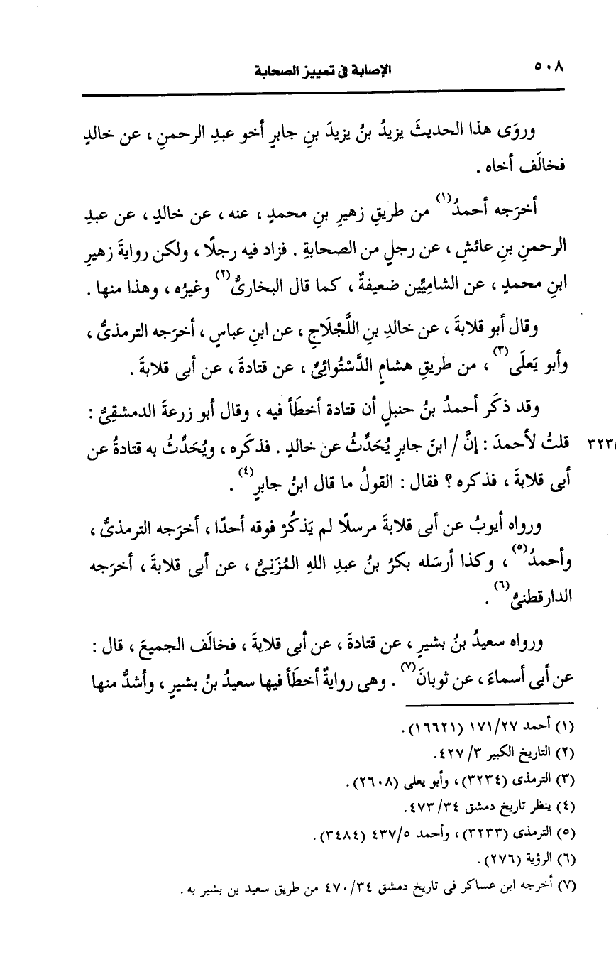 وقد ذكر أَحمد بن حنبل أن قتادة أخطأ فيه وقال أَبو زُرعة الدمشقي قلت: لأَحمد بن جابر أيحدث، عَن خالد فذكره ويحدث به قتادة، عَن أبي قلابة فذكره فقال القول ما قال ابن جابر.