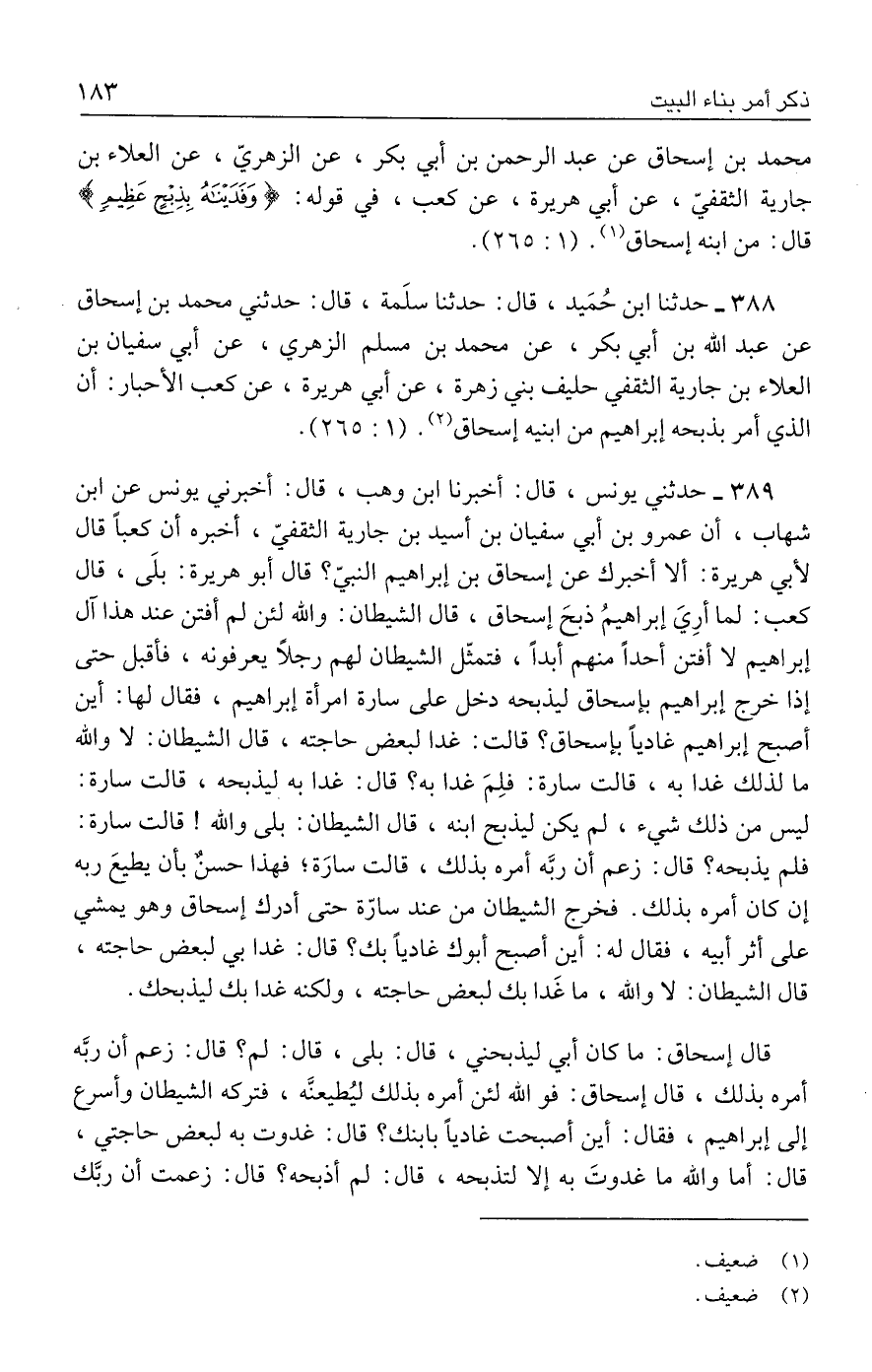 ٣٨٨ - حدثنا ابن حُمَيد، قال: حدثنا سلَمة، قال: حدثني محمد بن إسحاق عن عبد الله بن أبي بكر، عن محمد بن مسلم الزهري، عن أبي سفيان بن العلاء بن جارية الثقفي حليف بني زهرة، عن أبي هريرة، عن كعب الأحبار: أن الذي أمر بذبحه إبراهيم من ابنيه إسحاق (٢). (١: ٢٦٥).