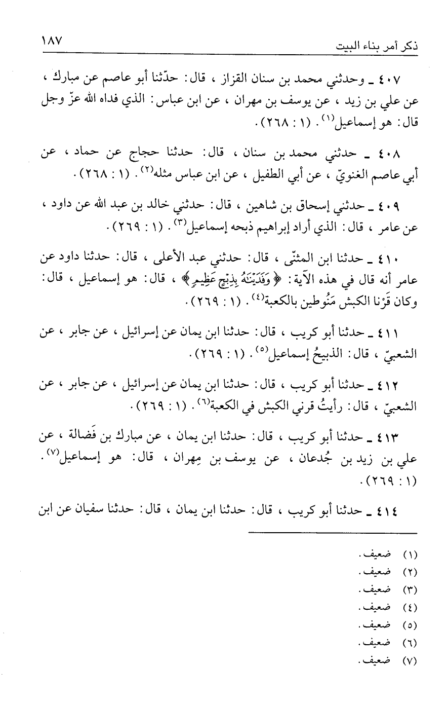 ٤١١ - حدثنا أبو كريب، قال: حدثنا ابن يمان عن إسرائيل، عن جابر، عن الشعبيّ، قال: الذبيحُ إسماعيل (٥). (١: ٢٦٩).