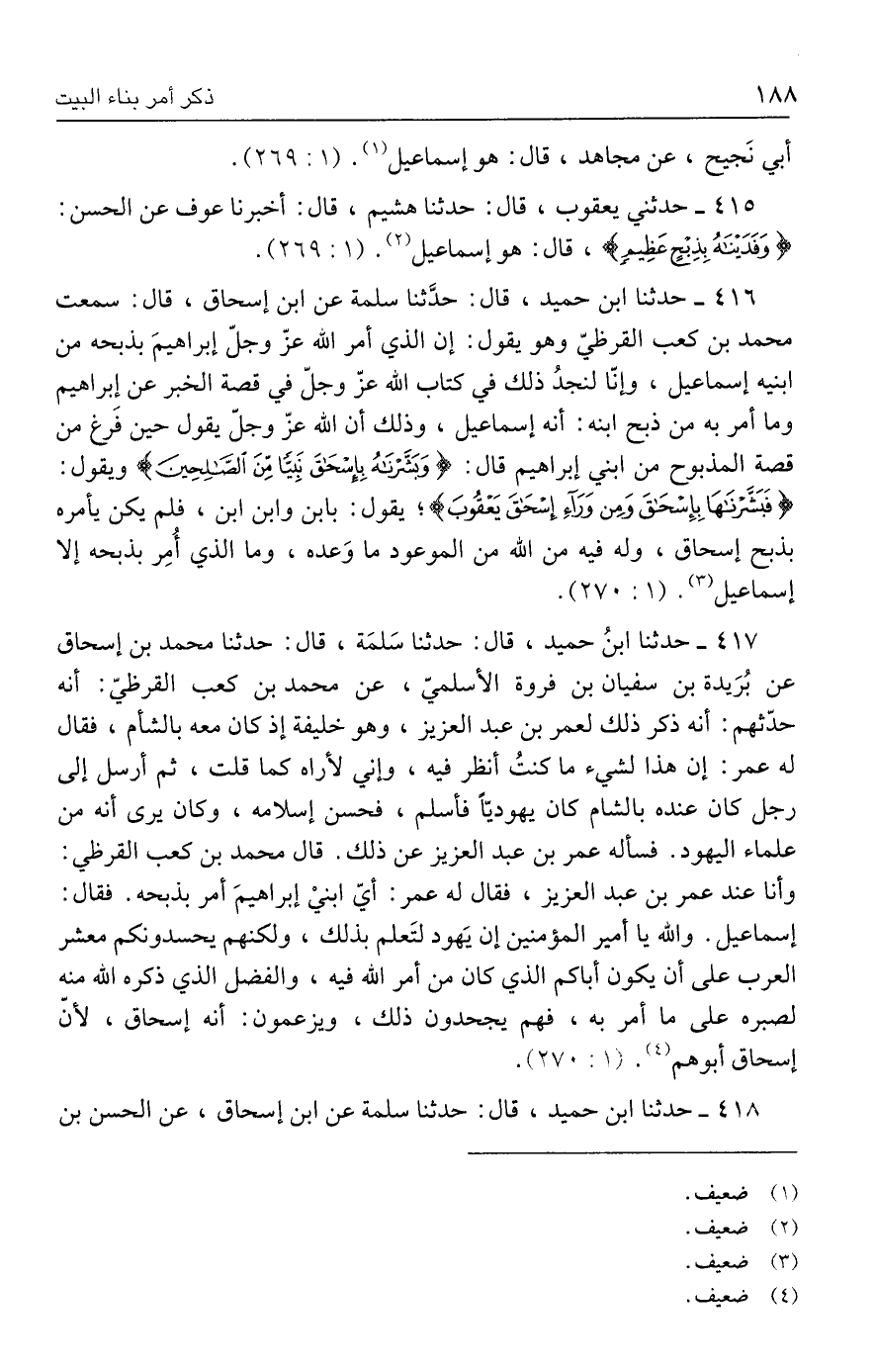 ٤١٦ - حدثنا ابن حميد، قال: حدَّثنا سلمة عن ابن إسحاق، قال: سمعت محمد بن كعب القرظيّ وهو يقول: إن الذي أمر الله عزّ وجلّ إبراهيمَ بذبحه من ابنيه إسماعيل، وإنّا لنجدُ ذلك في كتاب الله عزّ وجلّ في قصة الخبر عن إِبراهيم وما أمر به من ذبح ابنه: أنه إسماعيل، وذلك أن الله عزّ وجلّ يقول حين فرغ من قصة المذبوح من ابني إبراهيم قال: {وَبَشَّرْنَاهُ بِإِسْحَاقَ نَبِيًّا مِنَ الصَّالِحِينَ (١١٢)} ويقول: {فَبَشَّرْنَاهَا بِإِسْحَاقَ وَمِنْ وَرَاءِ إِسْحَاقَ يَعْقُوبَ}؛ يقول: بابن وابن ابن، فلم يكن يأمره بذبح إسحاق، وله فيه من الله من الموعود ما وَعده، وما الذي أُمِر بذبحه إلا إسماعيل (٣). (١: ٢٧٠).