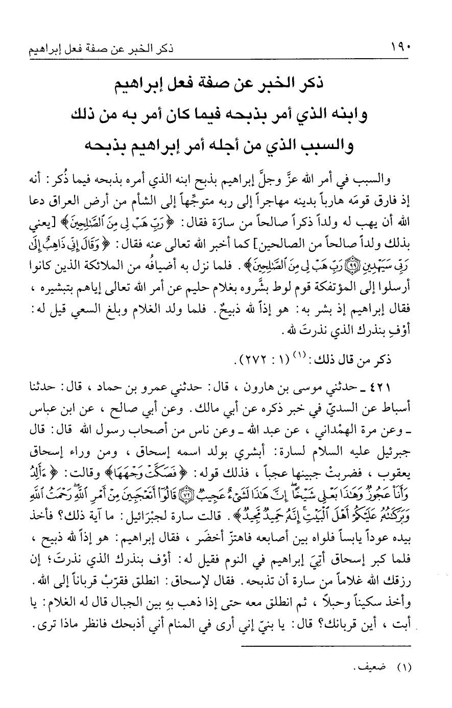 ٤٢١ - حدثني موسى بن هارون، قال: حدثني عمرو بن حماد، قال: حدثنا أسباط عن السديّ في خبر ذكره عن أبي مالك. وعن أبي صالح، عن ابن عباس -وعن مرة الهمْداني، عن عبد الله- وعن ناس من أصحاب رسول الله قال: قال جبرئيل - عليه السلام - لسارة: أبشري بولد اسمه إسحاق، ومن وراء إسحاق يعقوب، فضربتْ جبينها عجبًا، فذلك قوله: {فَصَكَّتْ وَجْهَهَا} وقالت: {أَأَلِدُ وَأَنَا عَجُوزٌ وَهَذَا بَعْلِي شَيخًا إِنَّ هَذَا لَشَيءٌ عَجِيبٌ (٧٢) قَالُوا أَتَعْجَبِينَ مِنْ أَمْرِ اللَّهِ رَحْمَتُ اللَّهِ وَبَرَكَاتُهُ عَلَيكُمْ أَهْلَ الْبَيتِ إِنَّهُ حَمِيدٌ مَجِيدٌ (٧٣)}. قالت سارة لجبْرَائيل: ما آية ذلك؟ فأخذ بيده عودًا يابسًا فلواه بين أصابعه فاهتزّ أخضَر، فقال إبراهيم: هو إذًا لله ذبيح، فلما كبر إسحاق أتِيَ إبراهيم في النوم فقيل له: أوْف بنذرك الذي نذرتَ؛ إن رزقك الله غلامًا من سارة أن تذبحه. فقال لإسحاق: انطلق فقرّبْ قربانًا إلي الله. وأخذ سكينًا وحبلًا، ثم انطلق معه حتى إذا ذهب بهِ بين الجبال قال له الغلام: يا أبت، أين قربانك؟ قال: يا بنيّ إني أري في المنام أني أذبحك فانظر ماذا تري.