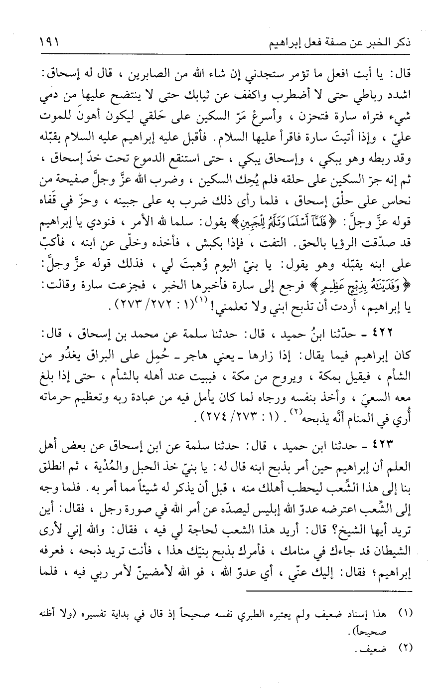 ٤٢٢ - حدَّثنا ابنُ حميد، قال: حدثنا سلمة عن محمد بن إسحاق، قال: كان إبراهيم فيما يقال: إذا زارها -يعني هاجر- حُمِل علي البراق يغدُو من الشأم، فيقيل بمكة، ويروح من مكة، فيبيت عند أهله بالشأم، حتى إذا بلغ معه السعيَ، وأخذ بنفسه ورجاه لما كان يأمل فيه من عبادة ربه وتعظيم حرماته أُري في المنام أنَّه يذبحه (٢). (١: ٢٧٣/ ٢٧٤).