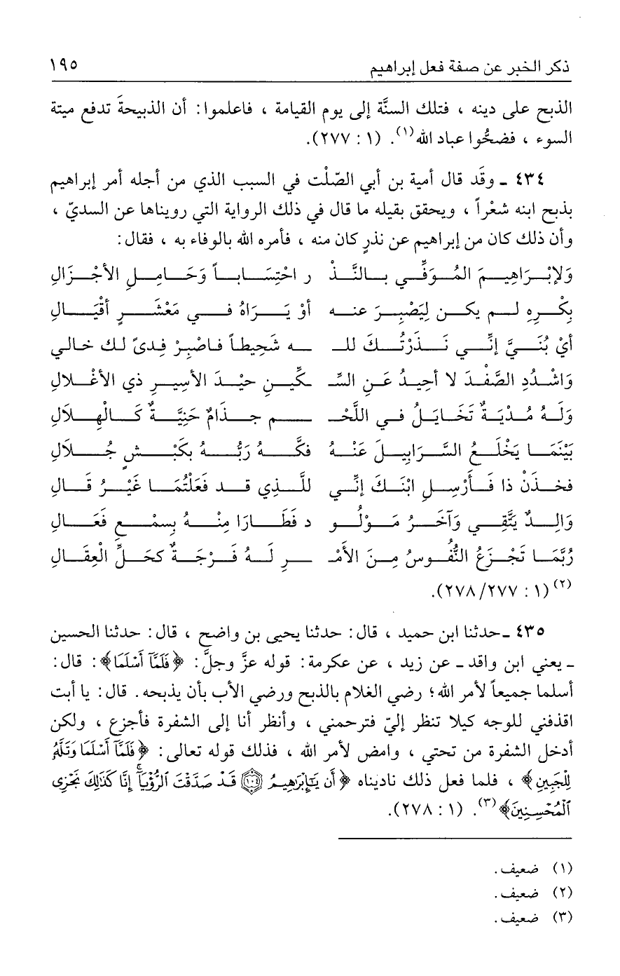 ٤٣٤ - وقَد قال أمية بن أبي الصّلْت في السبب الذي من أجله أمر إبراهيم بذبح ابنه شعْرًا، ويحقق بقيله ما قال في ذلك الرواية التي رويناها عن السديّ، وأن ذلك كان من إبراهيم عن نذرٍ كان منه، فأمره الله بالوفاء به، فقال: