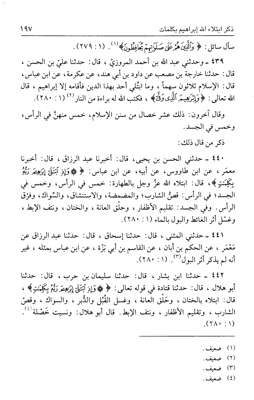 ٤٤٠ - حدثني الحسن بن يحيى، قال: أخبرنا عبد الرزاق، قال: أخبرنا معمَر، عن ابن طاووس، عن أبيه، عن ابن عباس: {وَإِذِ ابْتَلَى إِبْرَاهِيمَ رَبُّهُ بِكَلِمَاتٍ}، قال: ابتلاه الله عزَّ وجل بالطهارة: خمس في الرأس، وخمس في الجسد؛ في الرأس: قصُّ الشارب؛ والمضمضة، والاستنشاق، والسِّواك، وفرْق الرأس. وفي الجسد: تقليم الأظفار، وحلْق العانة، والختان، ونتف الإبط، وغسْل أثر الغائط والبول بالماء (١: ٢٨٠).