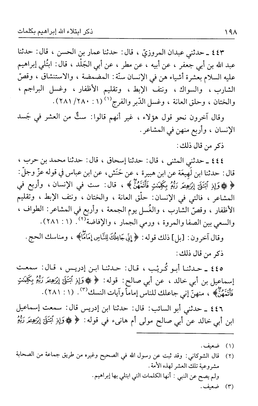 ٤٤٤ - حدثني المثني، قال: حدثنا إسحاق، قال: حدثنا محمد بن حرب، قال: حدثنا ابن لَهِيعَة عن ابن هبيرة، عن حَنَش، عن ابن عباس في قوله عزّ وجلّ: {وَإِذِ ابْتَلَى إِبْرَاهِيمَ رَبُّهُ بِكَلِمَاتٍ فَأَتَمَّهُنَّ}، قال: ست في الإنسان، وأربع في المشاعر، فالتي في الإنسان: حلْق العانة، والختان، ونتف الإبط، وتقليم الأظفار، وقصّ الشارب، والغُسل يوم الجمعة، وأربع في المشاعر: الطواف، والسعي بين الصفا والمروة، ورمي الجمار، والإفاضة (٢). (١: ٢٨١).